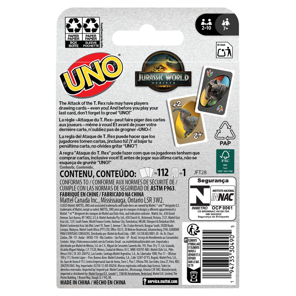 UNO Jurský svět přináší oblíbenou karetní hru v novém, dobrodružném stylu inspirovaném ikonickými obrázky z filmové série Jurský svět. Kromě klasických pravidel obsahuje i speciální kartu, která do hry přináší nový zvrat a ještě více napětí.