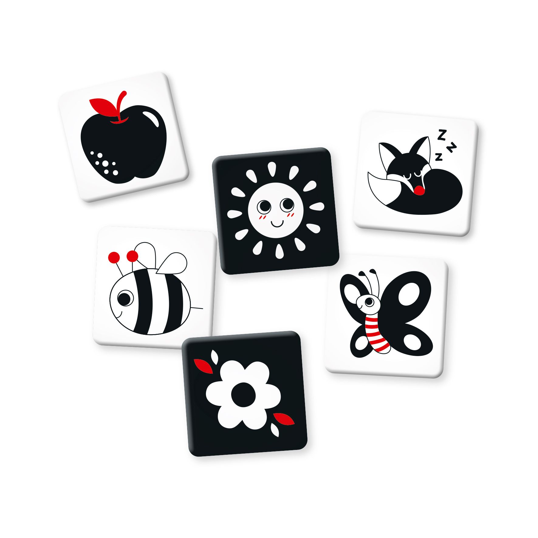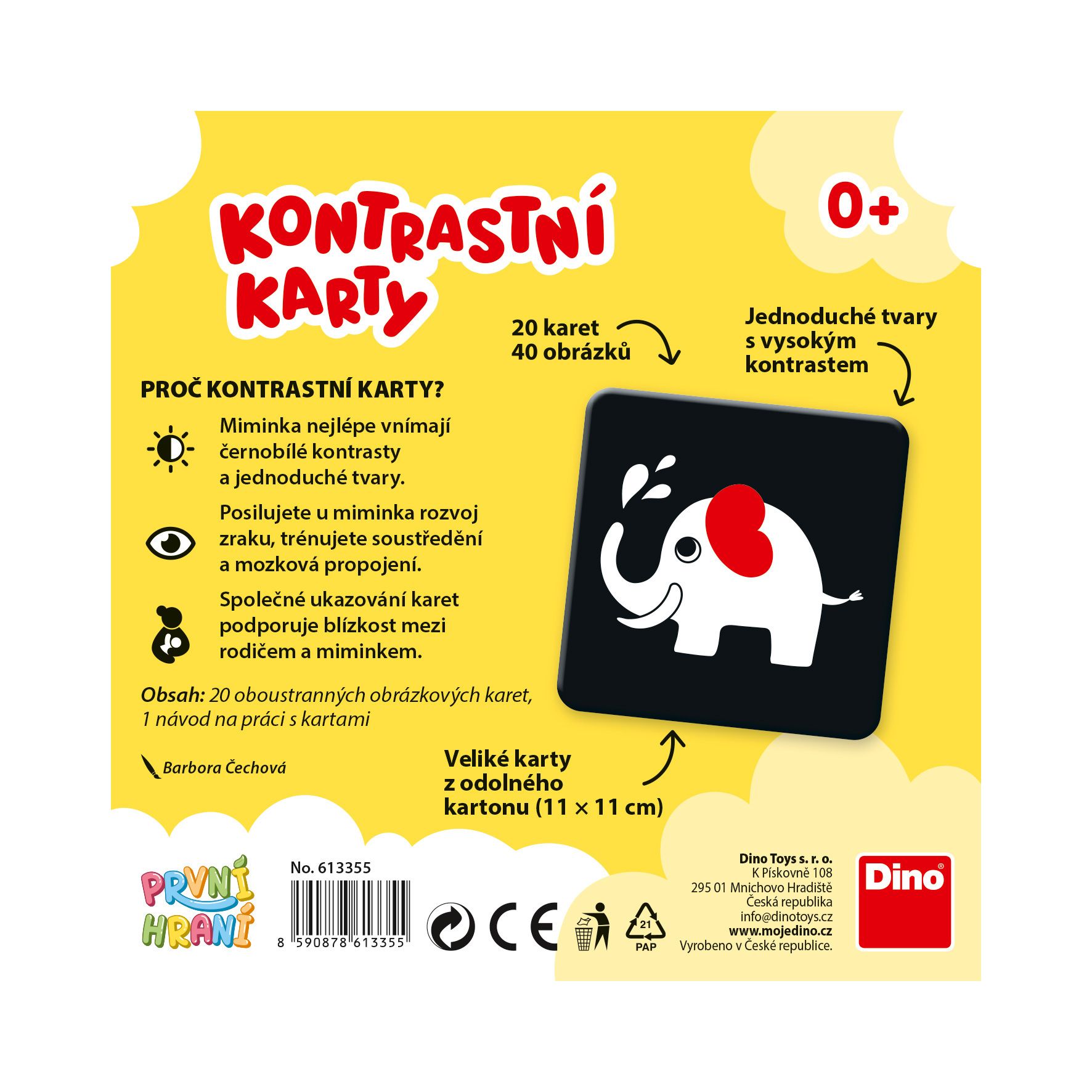Kontrastní karty jsou jednoduchá a zároveň velmi užitečná pomůcka v raném vývoji dítěte. Pomáhají rozvíjet zaostření oka, koordinaci hlavy a očí a podporují celkový kognitivní vývoj. Hra vhodná už od narození do cca 6 měsíců věku dítěte.