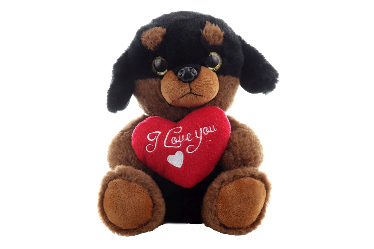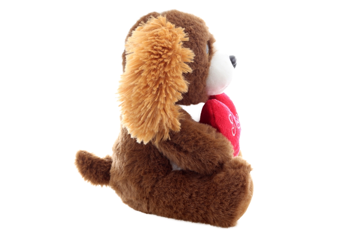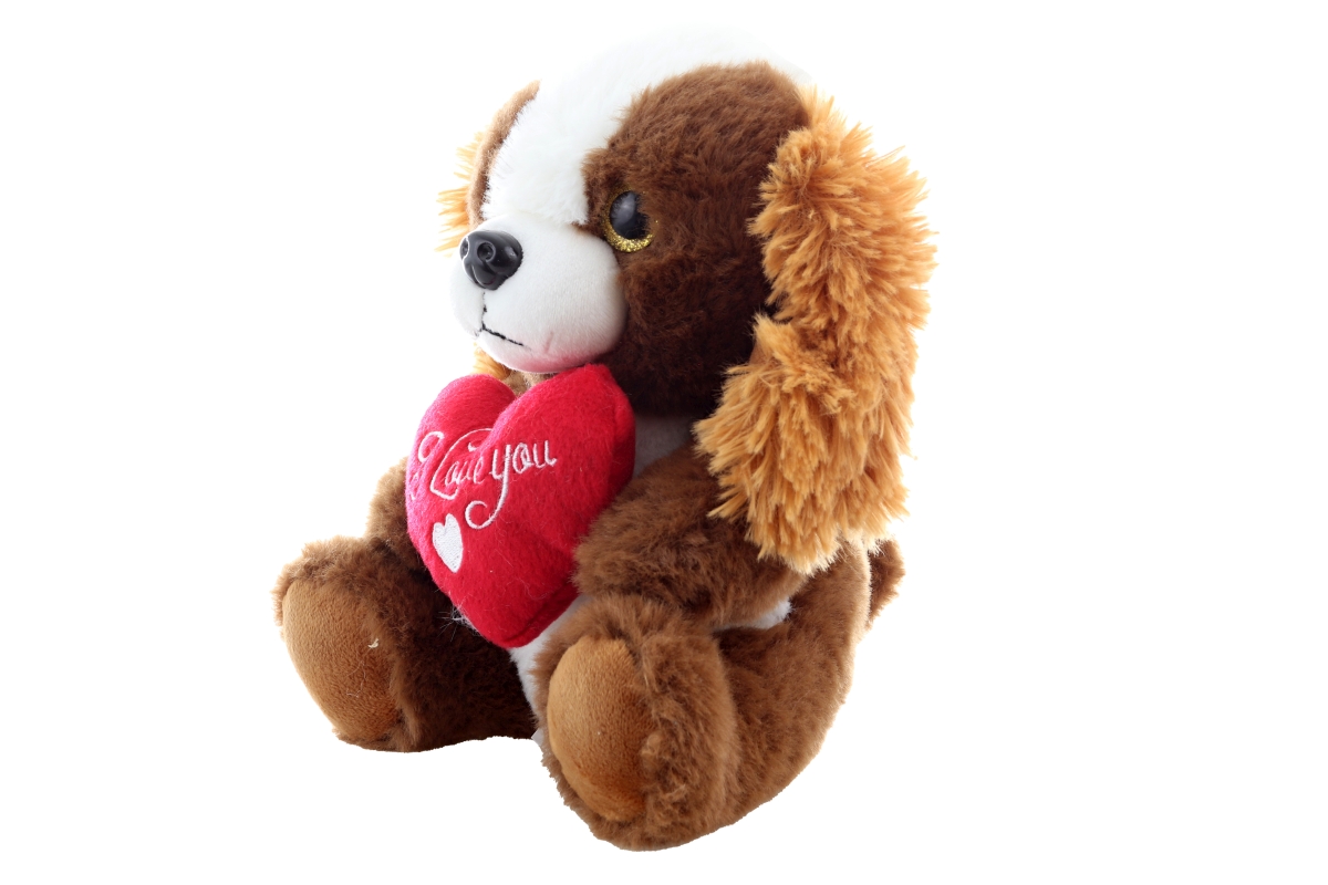 Plyšový pejsek se srdíčkem. Rozměry 18x21x14 cm. 2 druhy-dodáváme dle skladové dostupnosti. Věk 0+..