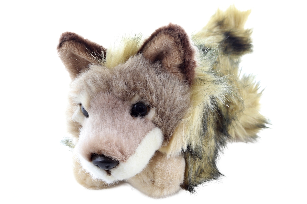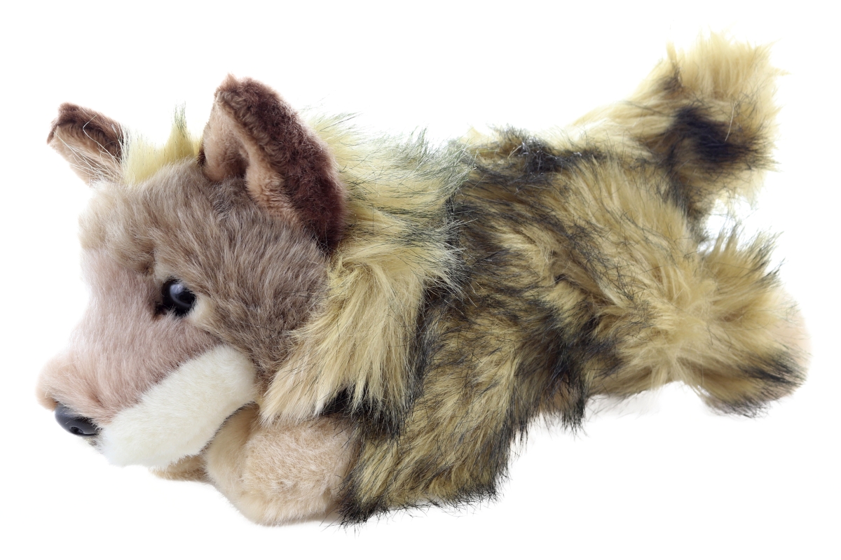 Plyšový kojot ležící o rozměrech 25x7x11 cm. Věk 0+..