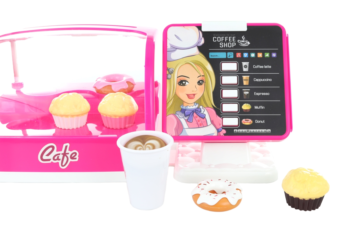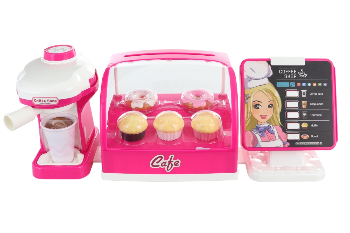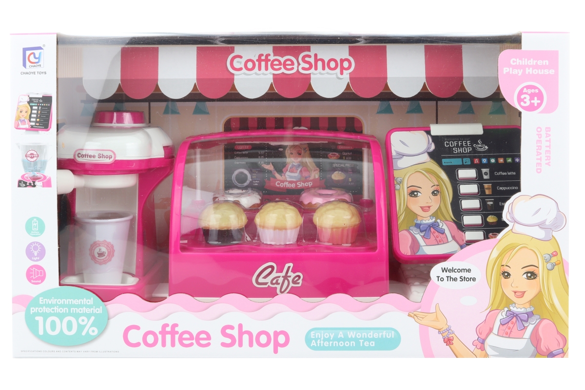 Velká kavárna s doplňky. Balení obsahuje kávovar, chladničku s dortíky a pokladnu. Napájení kávovaru na 2 AA baterie (nejsou součástí), chladničky na..