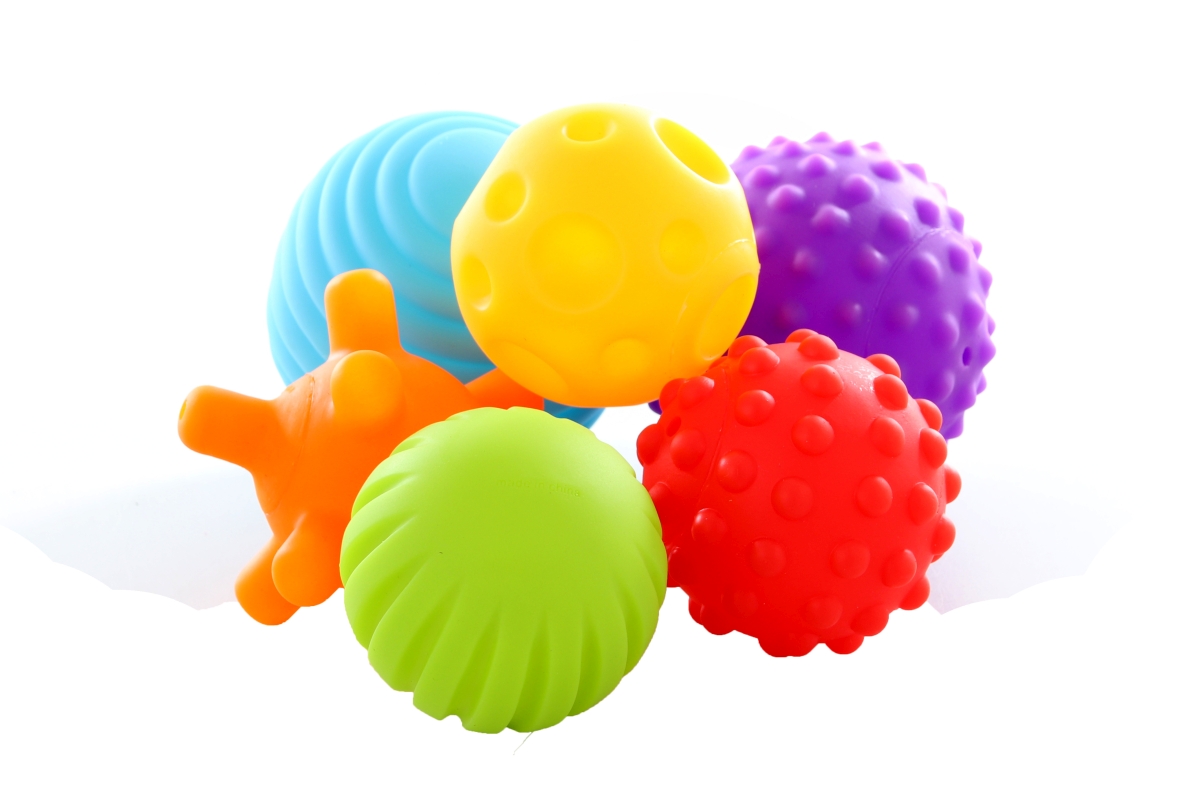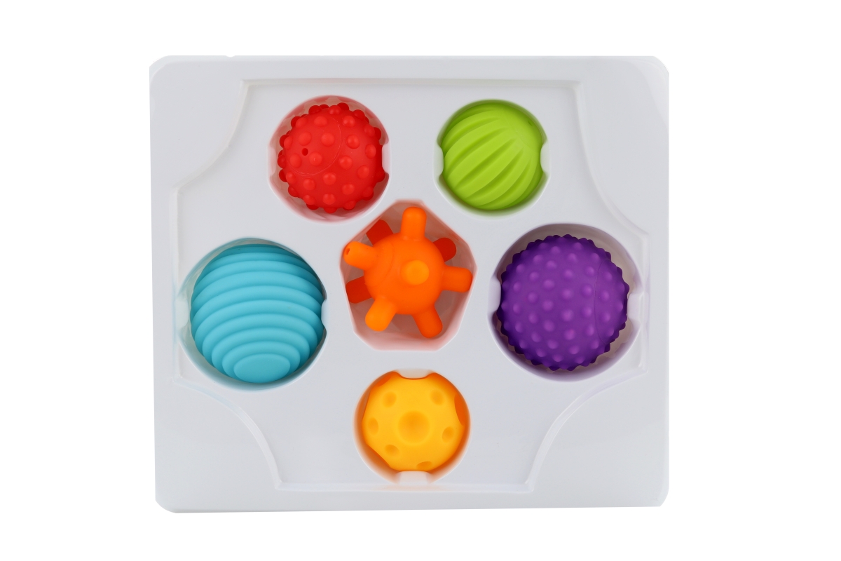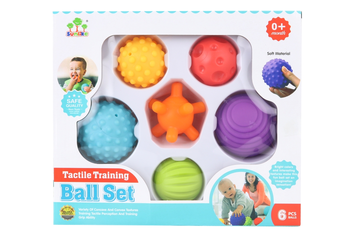 Sada gumových senzorických míčků. V balení je 6 kusů různých barev a tvarů. Rozměr jednoho míčku cca 6,5 x 6,5 cm (dle druhu). Rozměry balení cca 30 x..