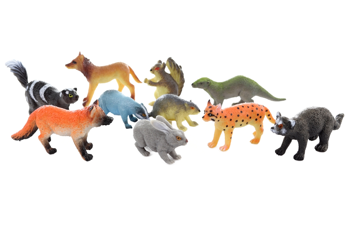 Plastová lesní zvířátka (liška, zajíc, rys, veverka, jezevec, vlk, vydra, bobr, mýval, skunk). Rozměry balení cca 15 x 18,5 x 3 cm. Rozměr zvířátek cc..