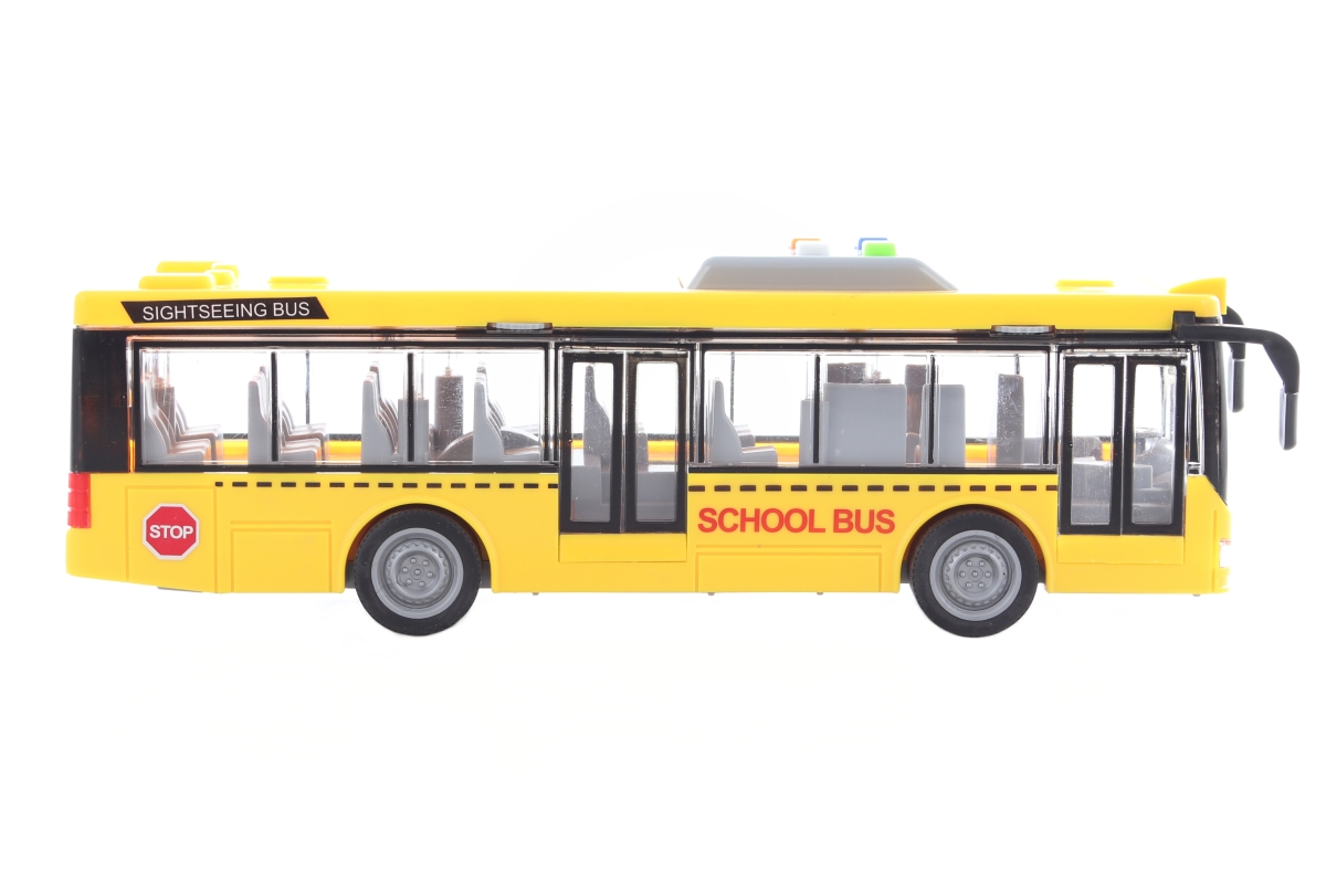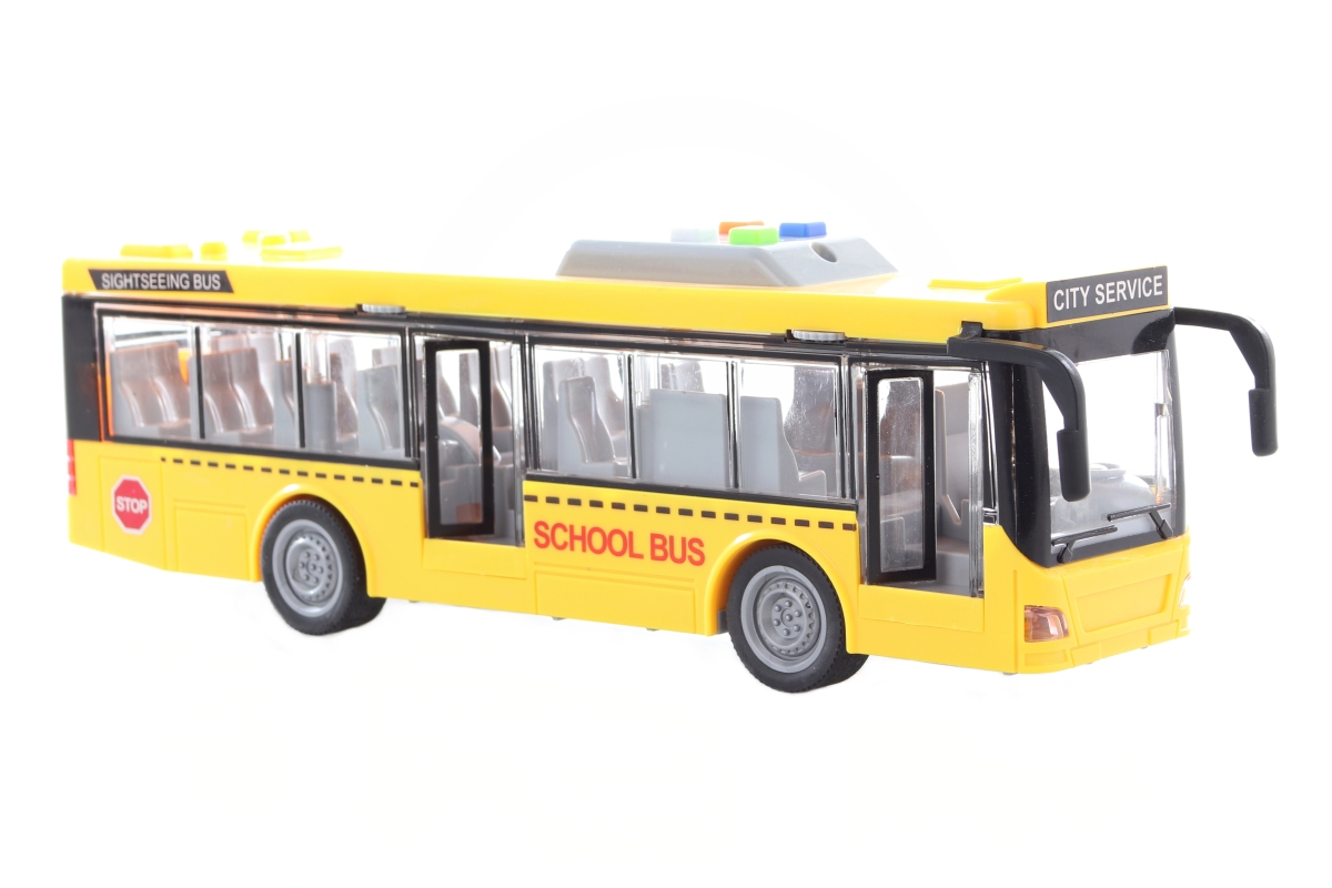 Plastový autobus na baterie. Autobus vydává zvuky a svítí. Rozměry cca 28,3 x 7,3 x 9 cm. Napájení na 3 AG13 baterie (jsou součástí). Rozměry balení c..