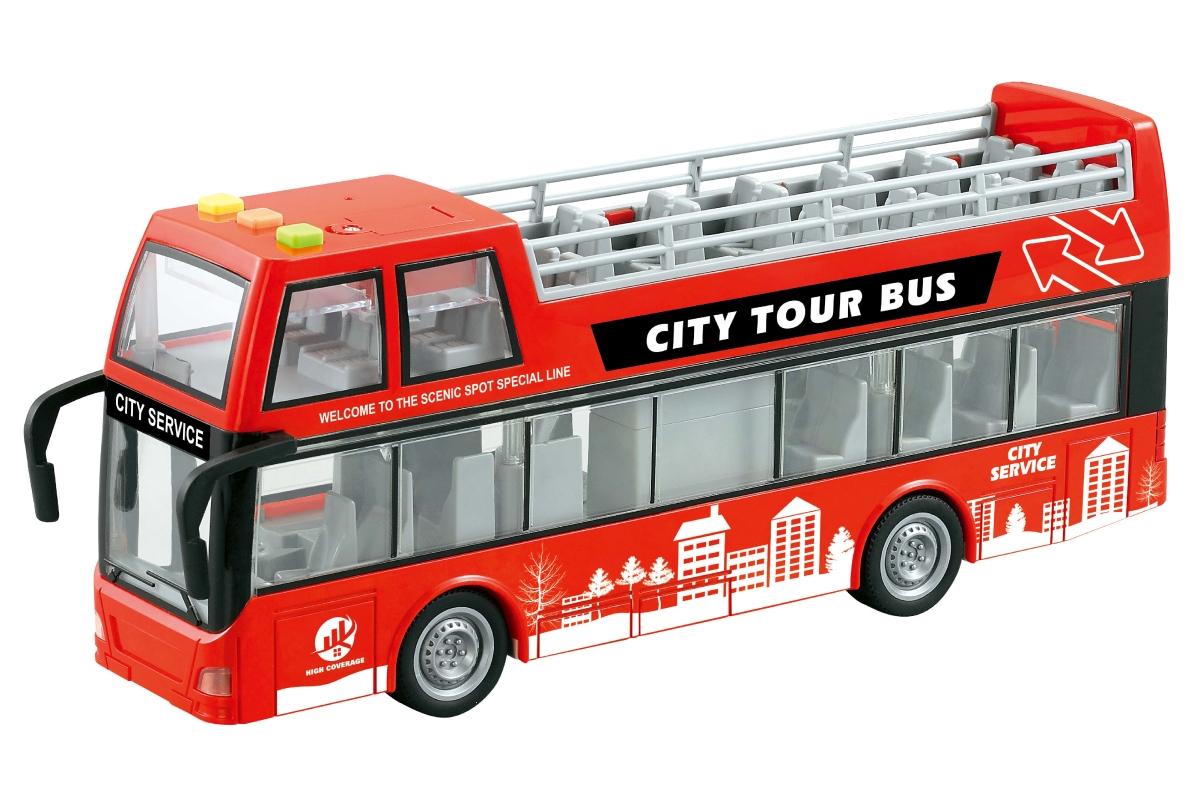 Plastový dvoupatrový autobus na baterie. Autobus vydává zvuky. Rozměry cca 28,5 x 7 x 11,3 cm. Napájení na 3 AG13 baterie (jsou součástí). Rozměry bal..