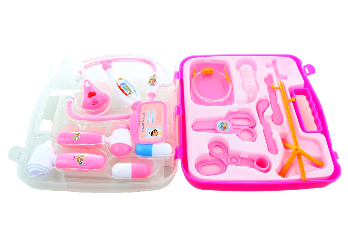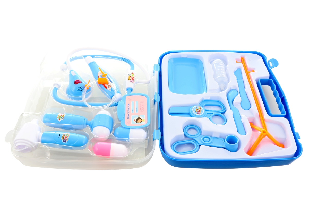 Velká doktorská sada v kufříku. Kufřík obsahuje cca 13 nástrojů včetně stetoskopu, který je na baterie - po zmačknutá tlačítka svítí srdíčko na stetos..
