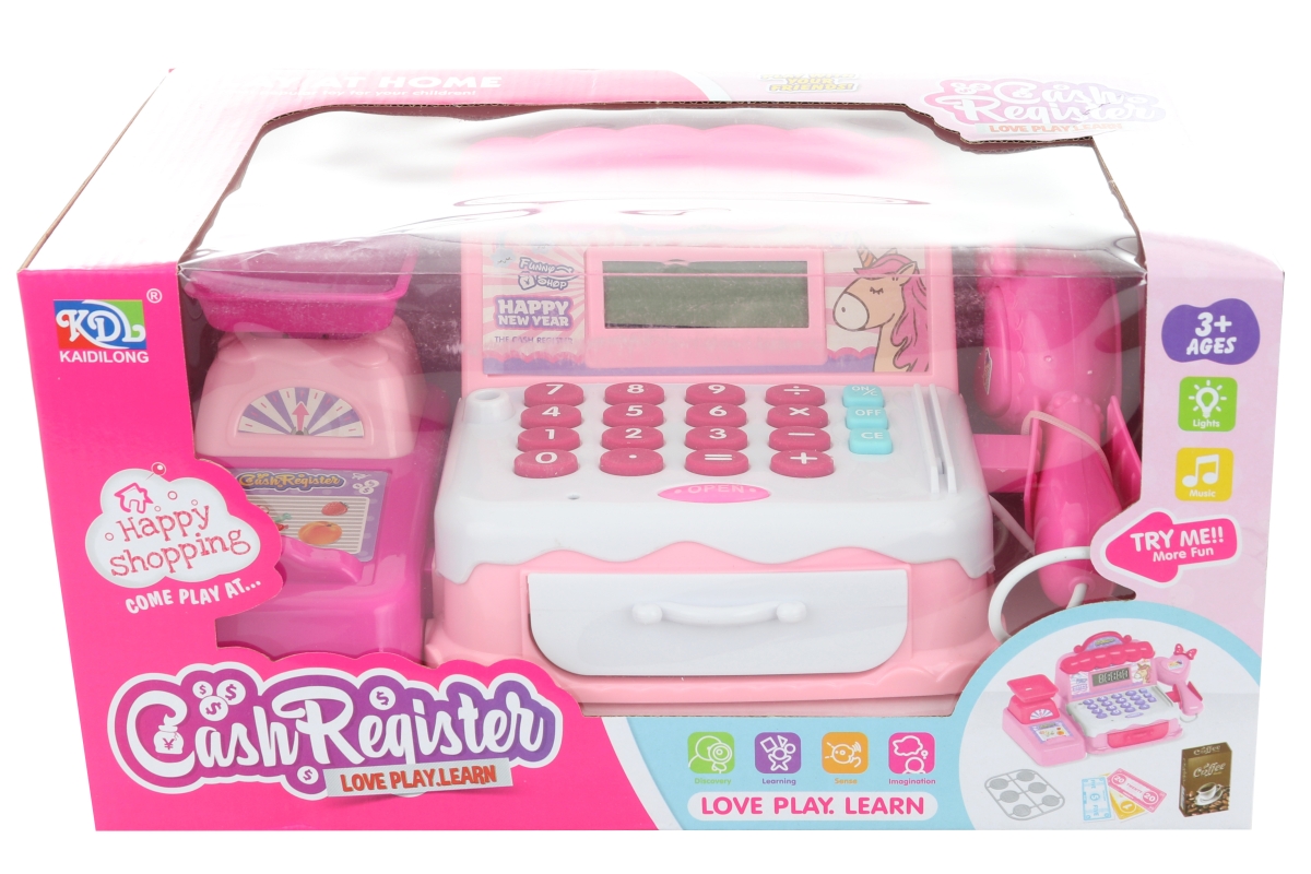 Plastová pokladna na baterie. Pokladna má vysunovací šuplík na peníze, váhu a snímač čárových kódů. Pokladna vydává zvuky, svítí a umí počítat. Součástí jsou také peníze. Napájení na 2 AA baterie (nejsou součástí). Rozměry pokladny cca 22 x 14 cm. Rozměry balení cca 27 x 13,5 x 15,5 cm. Věk 3+