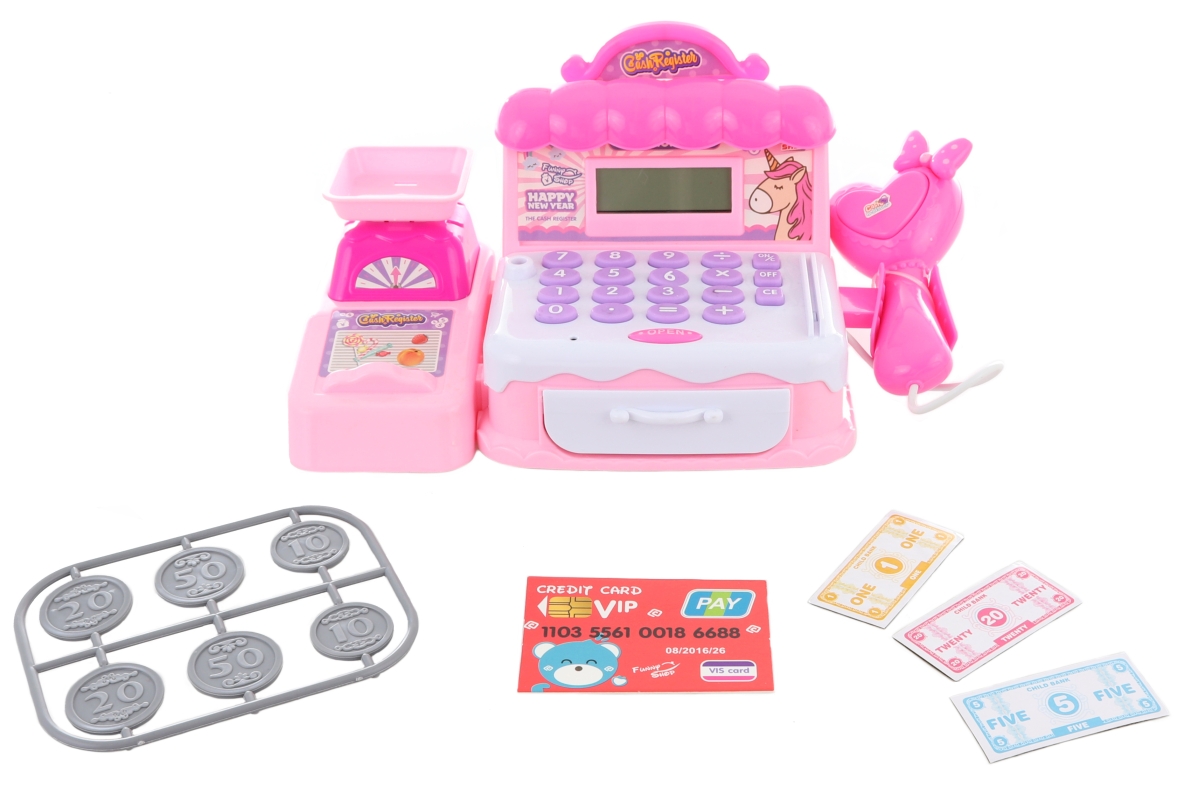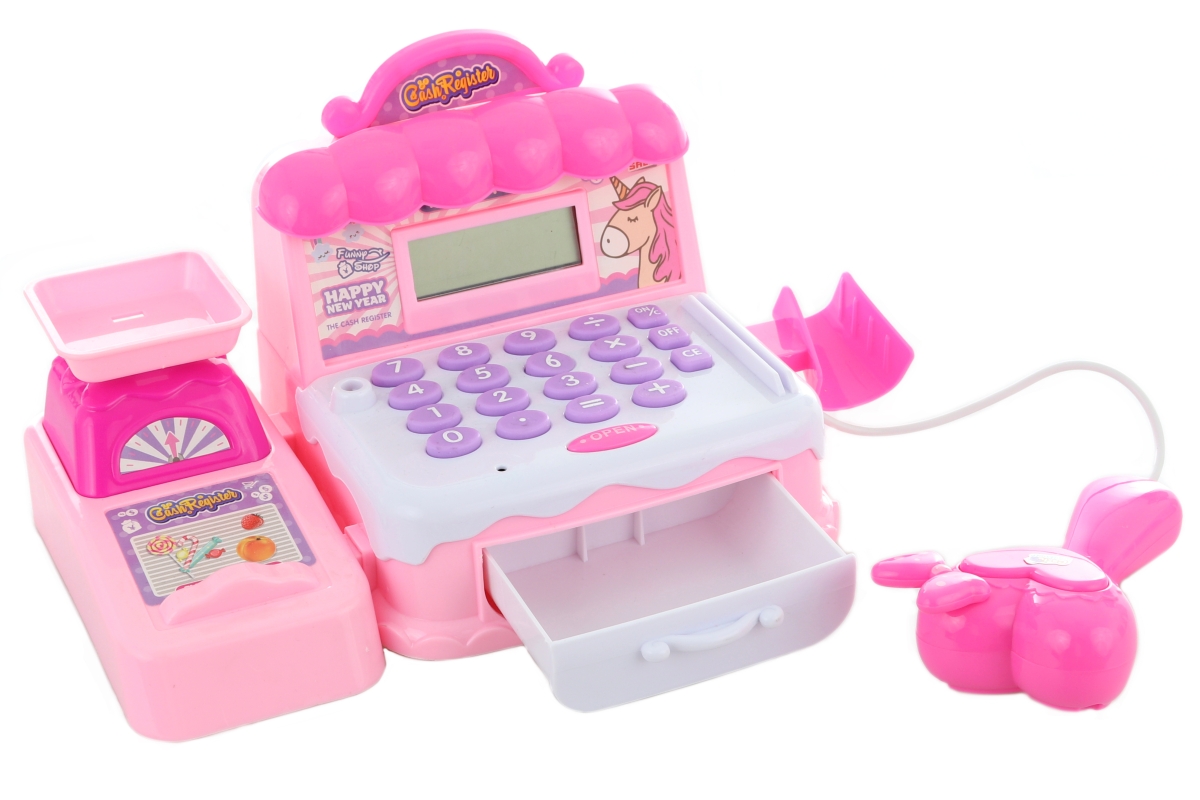 Plastová pokladna na baterie. Pokladna má vysunovací šuplík na peníze, váhu a snímač čárových kódů. Pokladna vydává zvuky, svítí a umí počítat. Součás..
