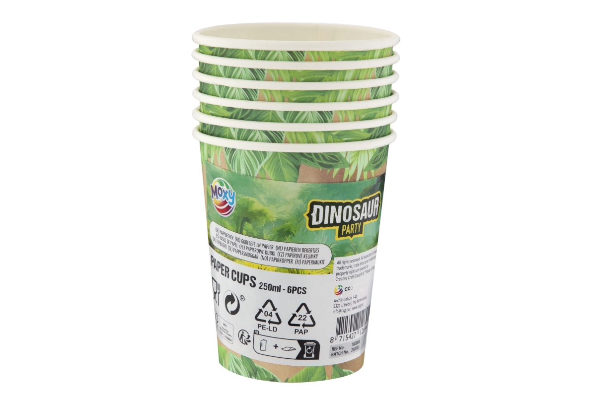 Papírové kelímky s motivem dino. Baleno po 6i kusech. Objem 250ml. Výrobek není hračka...