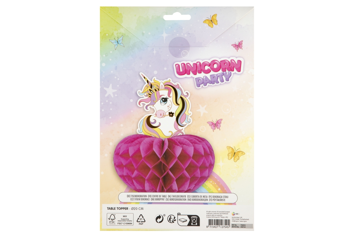 Stolní dekorace s motivem jednorožce. Průměr 20 cm. Rozměry balení cca 18,5x26,5x0,5 cm. Výrobek není hračka...