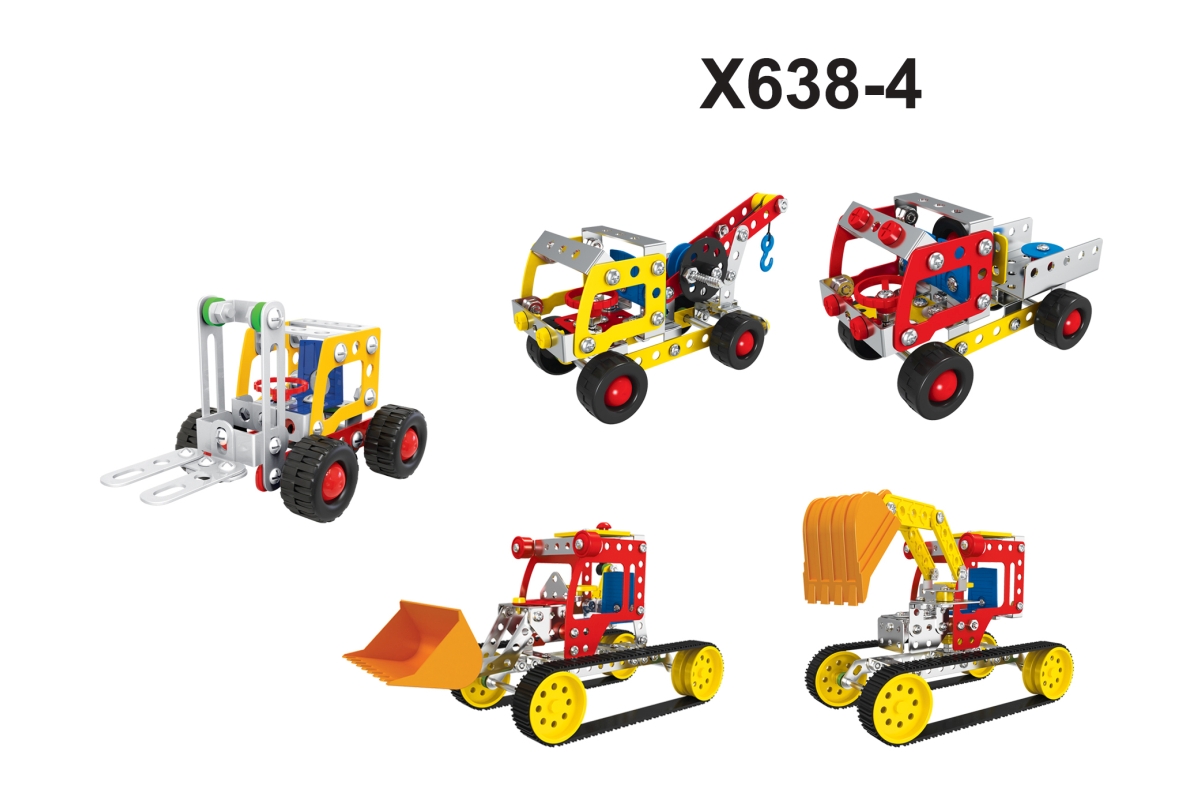 Kovová šroubovací stavebnice. Z dílků lze sestavit 5 různých stavebních aut. Celkem 244 dílků. Rozměry balení 35x26x5,5 cm. Věk 6+..