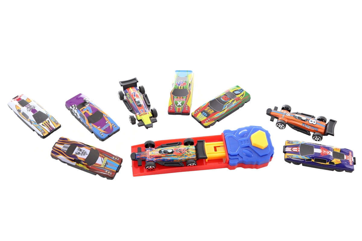 Sada kovových autíček o rozměru cca 7 x 2,5 cm s vystřelovací základnou. V sadě je 9 autíček a vystřelovací základna. Rozměr balení cca 25,5 x 21 x 2,..