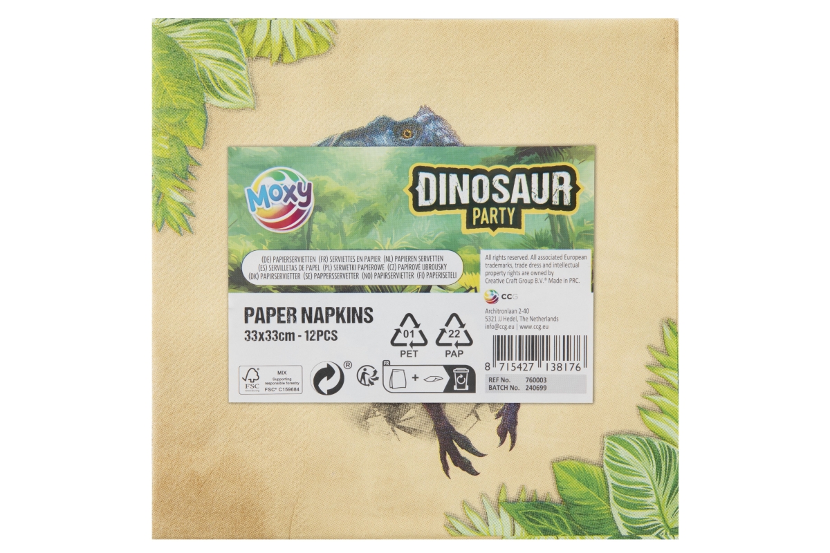 Papírové ubrousky s motivem dino. V balení 12 ks. Rozměry balení 16,5x16,5x0,5 cm. Rozměry ubrousku 33x33 cm. Výrobek není hračka...