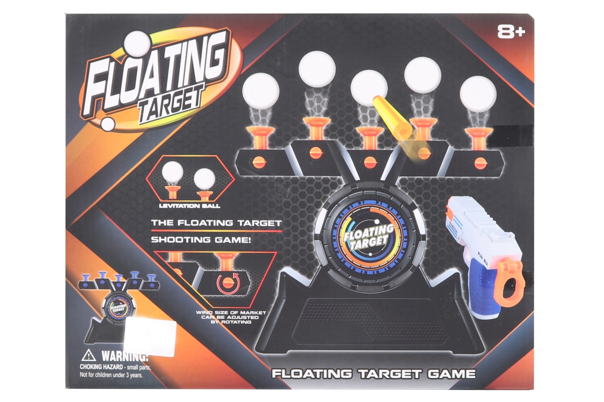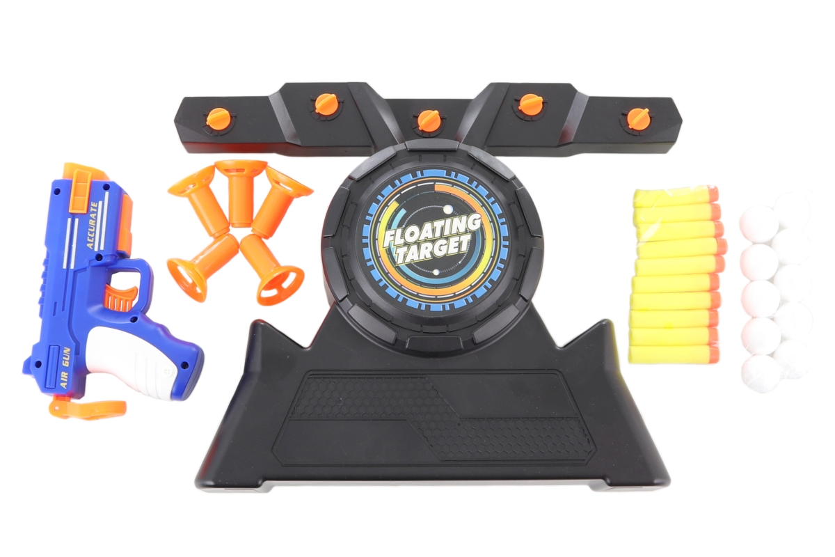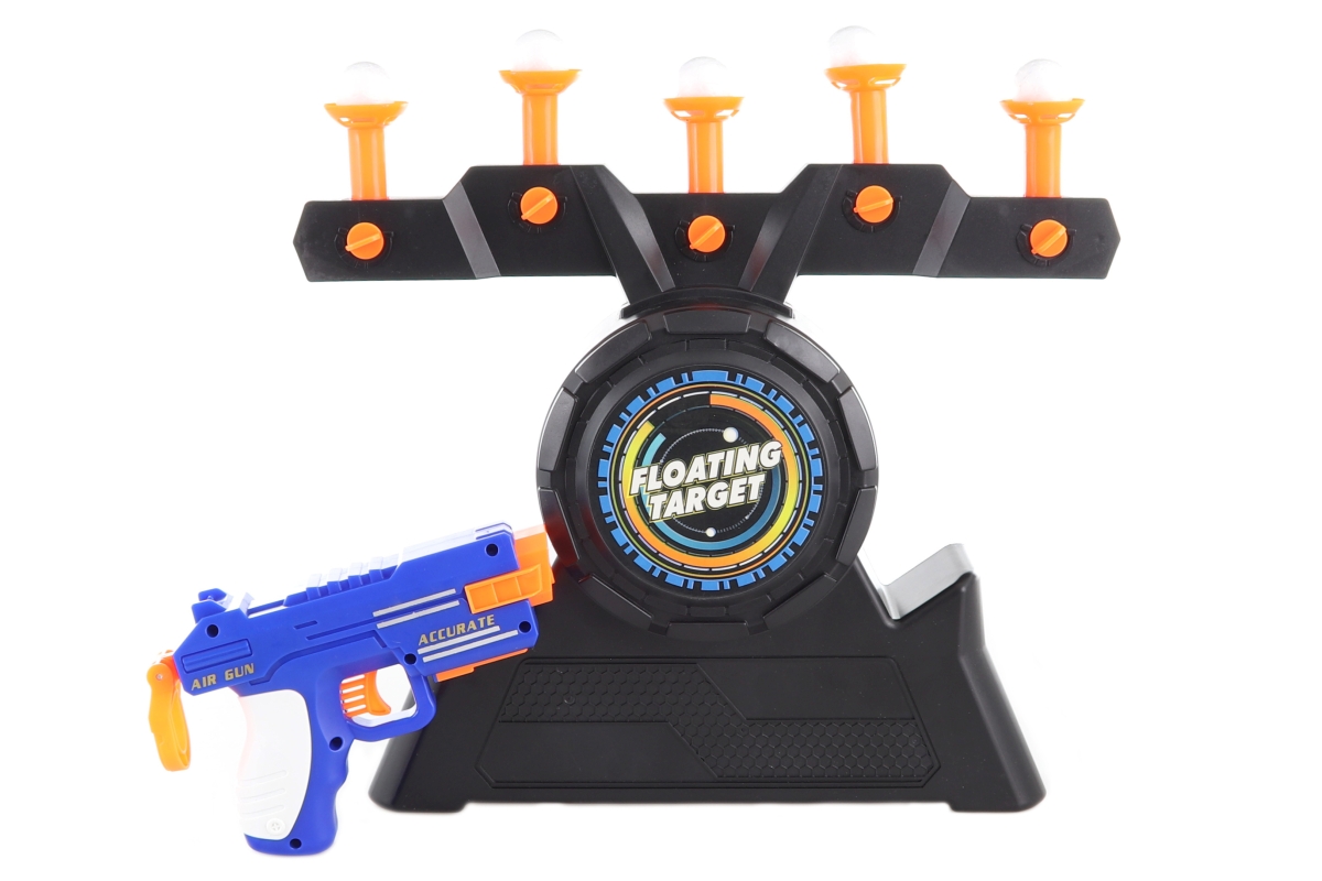 Terč na baterie s pistolí. Terčem jsou levitující míčky. Baterie 3 AA nejsou součástí balení. Rozměry balení 38 x 26 x 7,5 cm.