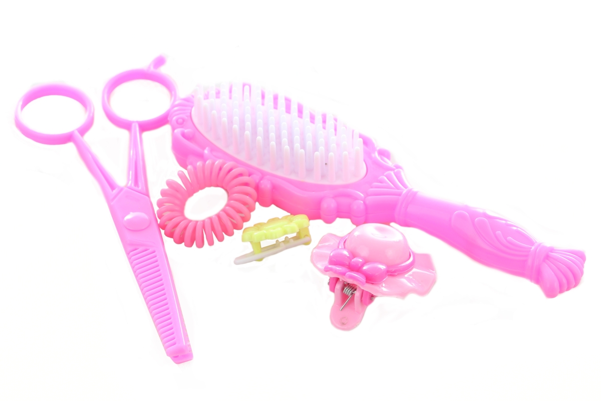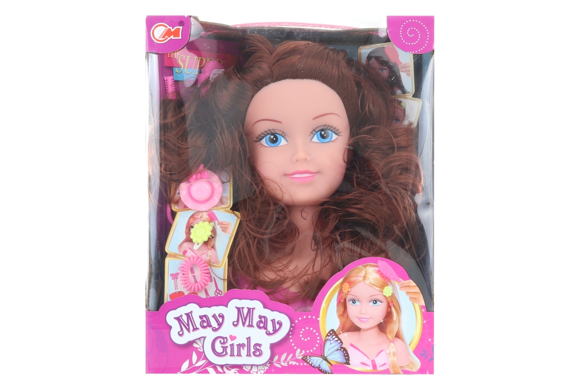 Česací hlava o rozměru cca 17 x 22 x 9 cm a gumičky, spirálky na vlasy, sponky, hřebínek a jiné doplňky. Rozměr balení cca 22,5 x 28,5 x 12 cm. Věk 3..