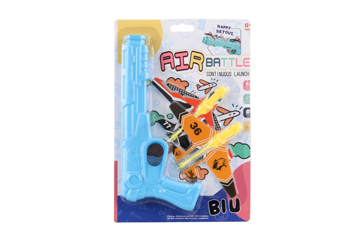 Plastová sada pistole, kterou se vystřelují letadla. Balení obsahuje pistoli a 2 letadýlka. Baleno na blistru. Rozměry balení cca 17,5x26x3 cm.