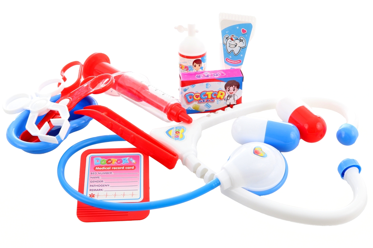 Doktorský set. Balení obsahuje stetoskop, zubařský set a spoustu menších doplňků, které lékař potřebuje. Baleno v krabici. Rozměry balení 46x31,5x4 cm..