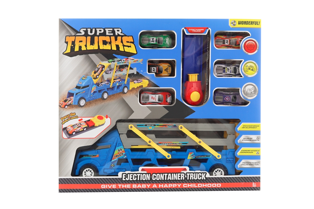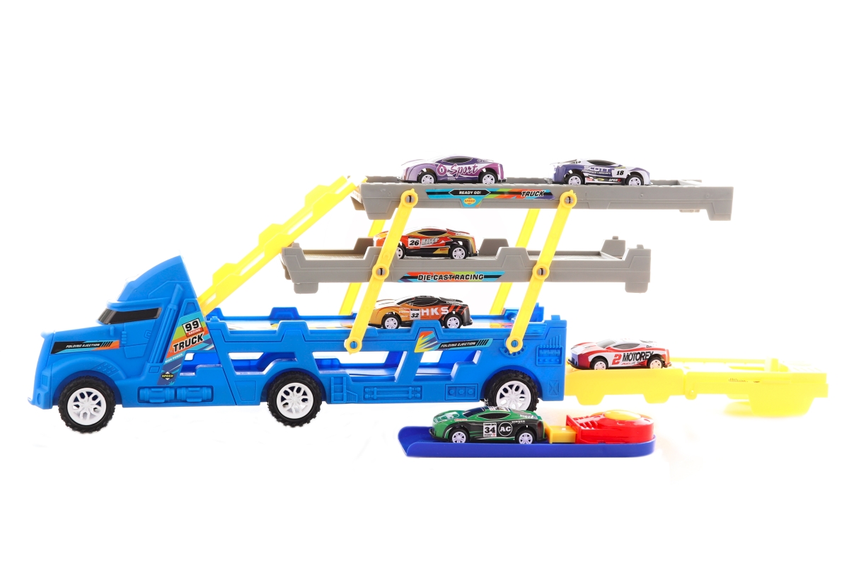 Velká sada pro kluky. Balení obsahuje velký kamion, 6 menších závodních autíček a vystřelovací plošinu. Plošina se připojí k zadní části kamionu a pom..