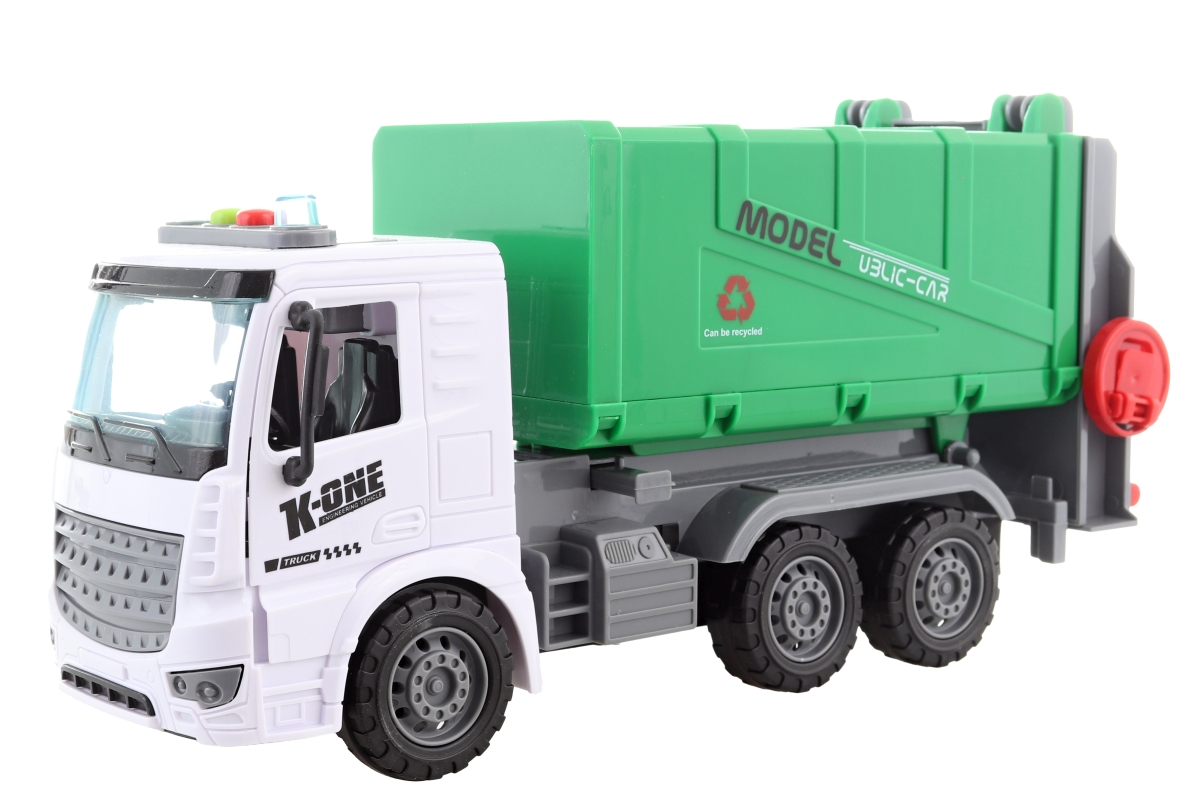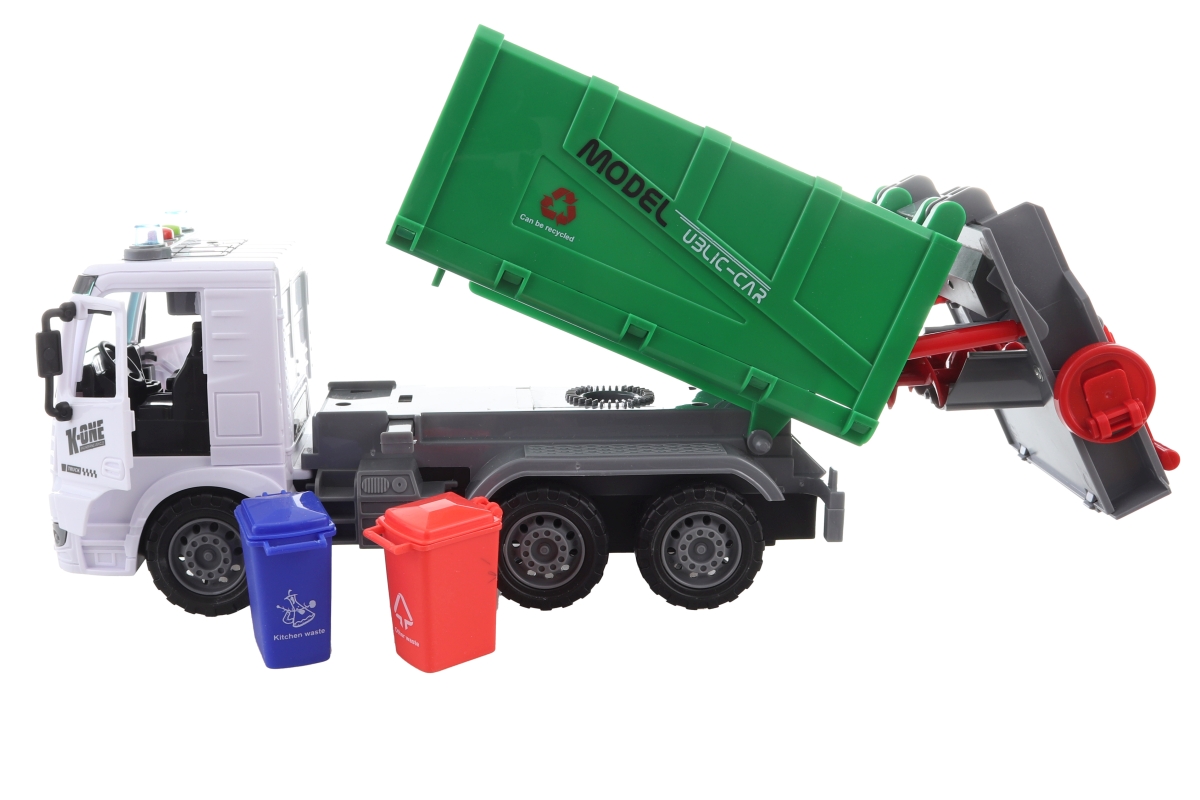 Plastové popelářské auto na baterie. Pomocí dvou tlačítek umístěných na kabině vydává zvuky jízdy a couvání.Obsahuje 2 popelnice,pomocí kolečka lze popelnice vysypávat. Baterie 3xAG13 jsou součástí balení. Manuálně lze otevírat zadní část nádoby na odpad. Baleno v krabici. Rozměry balení cca 32x11,5x18x5 cm. Rozměry auta cca 28x14x8,5 cm. Věk 3+