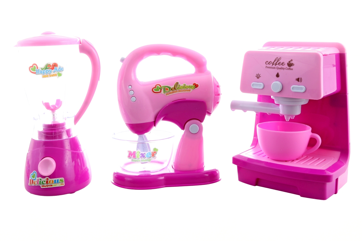 Sada obsahuje kávovar a 2 mixéry. Napájení na baterie-každý přístroj 2xAA, baterie nejsou součástí balení. Kávovar svítí a vydává zvuky, zároveň je možné nalít do nádobky vodu a ručně čerpat. Mixéry svítí, vydávají zvuky a točí se. Baleno v krabici. Rozměry balení cca 43x22x10 cm. Věk 3+