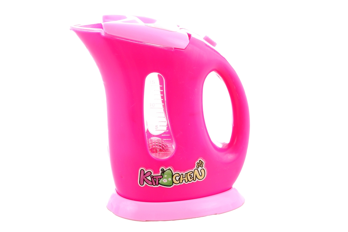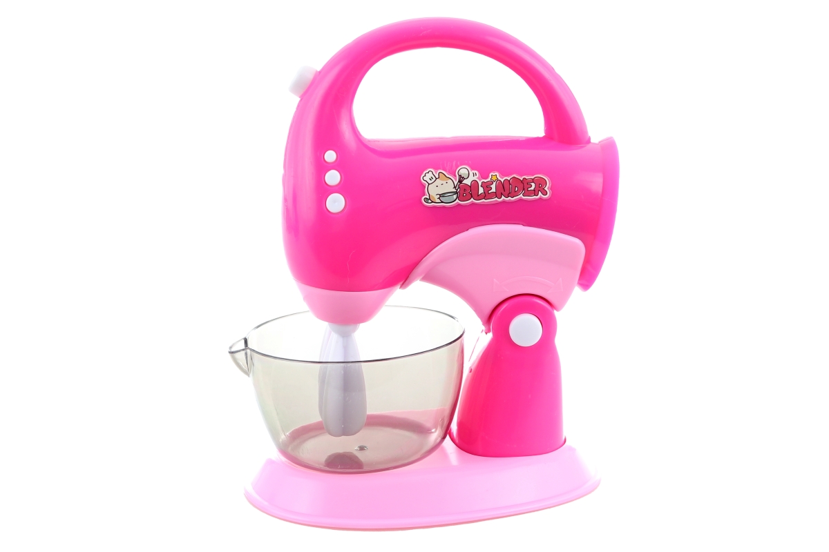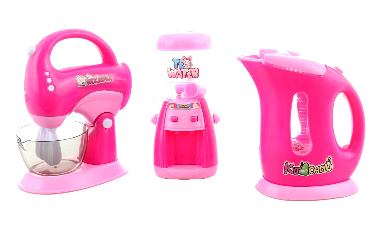 Sada domácích kuchyňských spotřebičů. Napájení na baterie(nejsou součástí balení)-konvice 2xAA(po zapnutí svítí a vydává zvuky vaření), šlehač 2xAA(po..