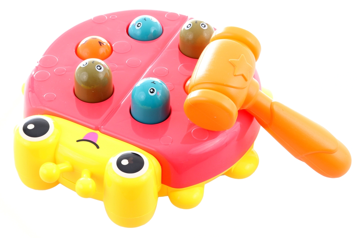 Zatloukačka beruška. Materiál plast. Po zatlučená jedné hlavičky vykoukne hlavička jiná. Baleno v krabici. Rozměry balení 21,5x19,5x6,5 cm. Věk 3+..