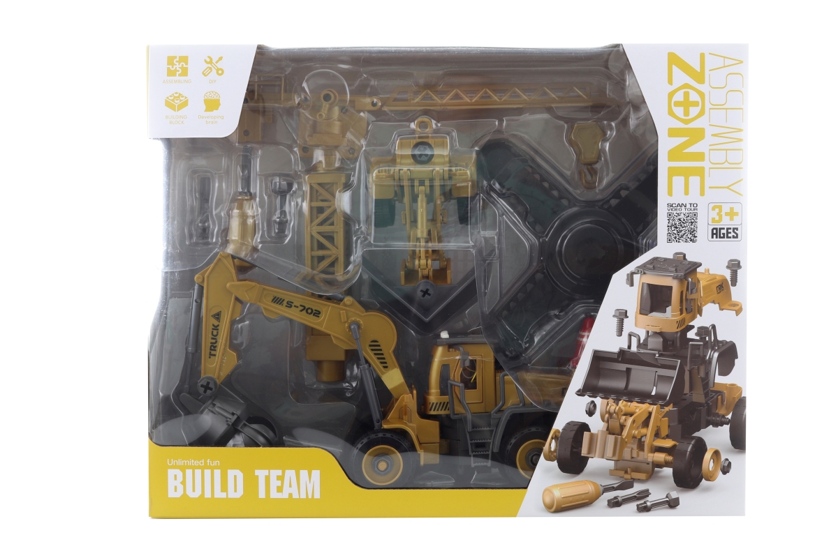 Stavební sada pro kluky. Materiál plast. Nakládací auto je napájeno na 3 AG13 baterie(jsou součástí balení) a po zapnutí svítí a vydává zvuky. Rozměry..