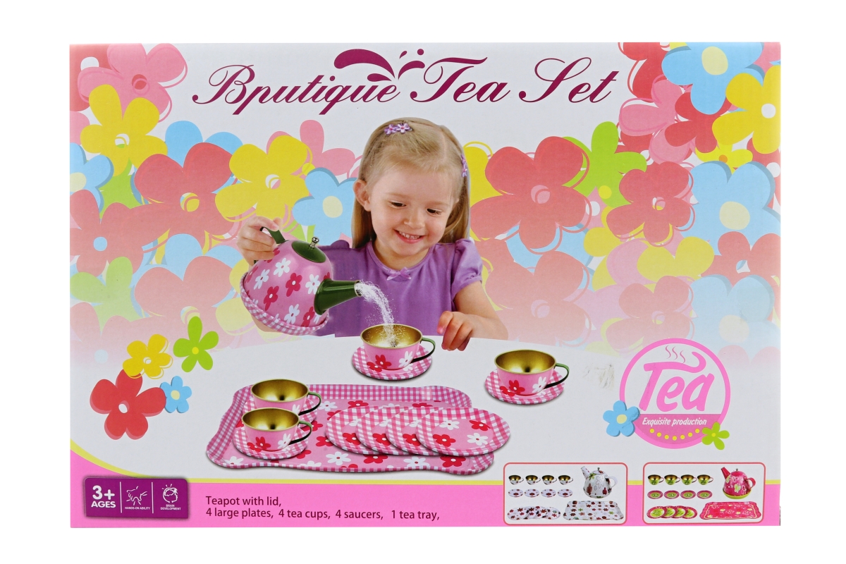 Čajový set obsahuje: 1x konvička cca 11cm, 4x hrníček s podšálkem, 4x talířek a 1x tác. Rozměry balení cca 32 x 22 x 9 cm. Věk 3+..