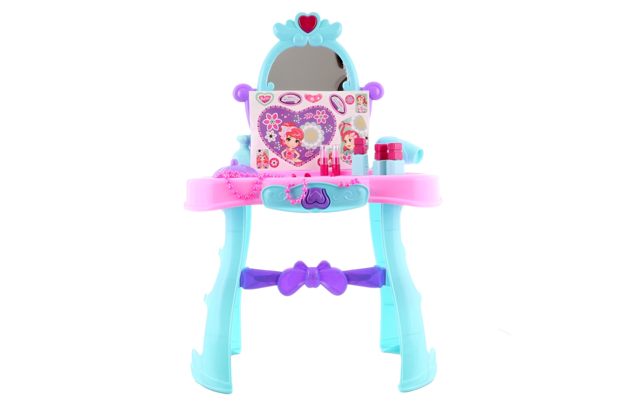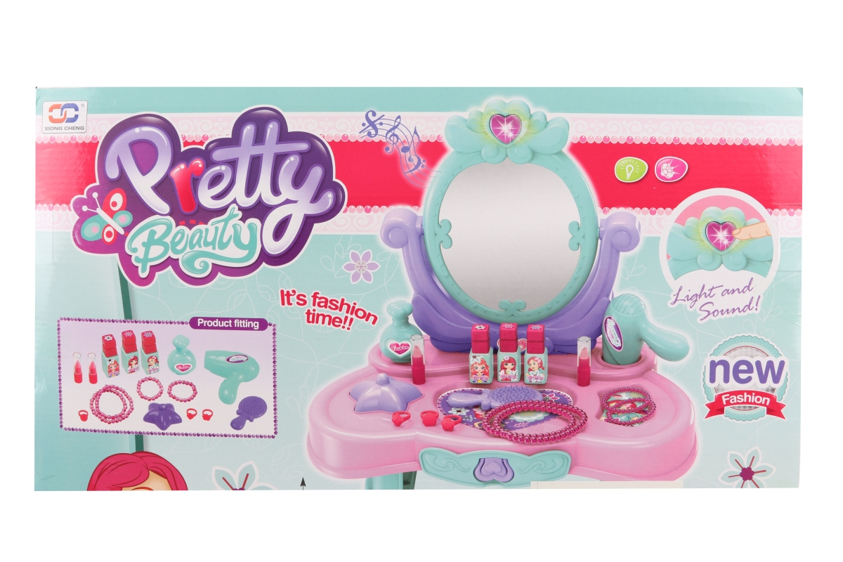 Toaletní stolek pro malé parádnice. Balení obsahuje stolek se zrcadlem, fén (není na baterie), hřeben, korále, 3 prstýnky, samolepky a menší doplňky na malování (nejsou funkční) Velikost stolku 44x28x66 cm. Materiál plast. Rozměry balení cca 53x43x9,5 cm. Napájení na 3 AAA baterie, které nejsou součástí balení. Po vložení baterií svítí a hraje srdíčko na vršku zrcadla. Věk 3+