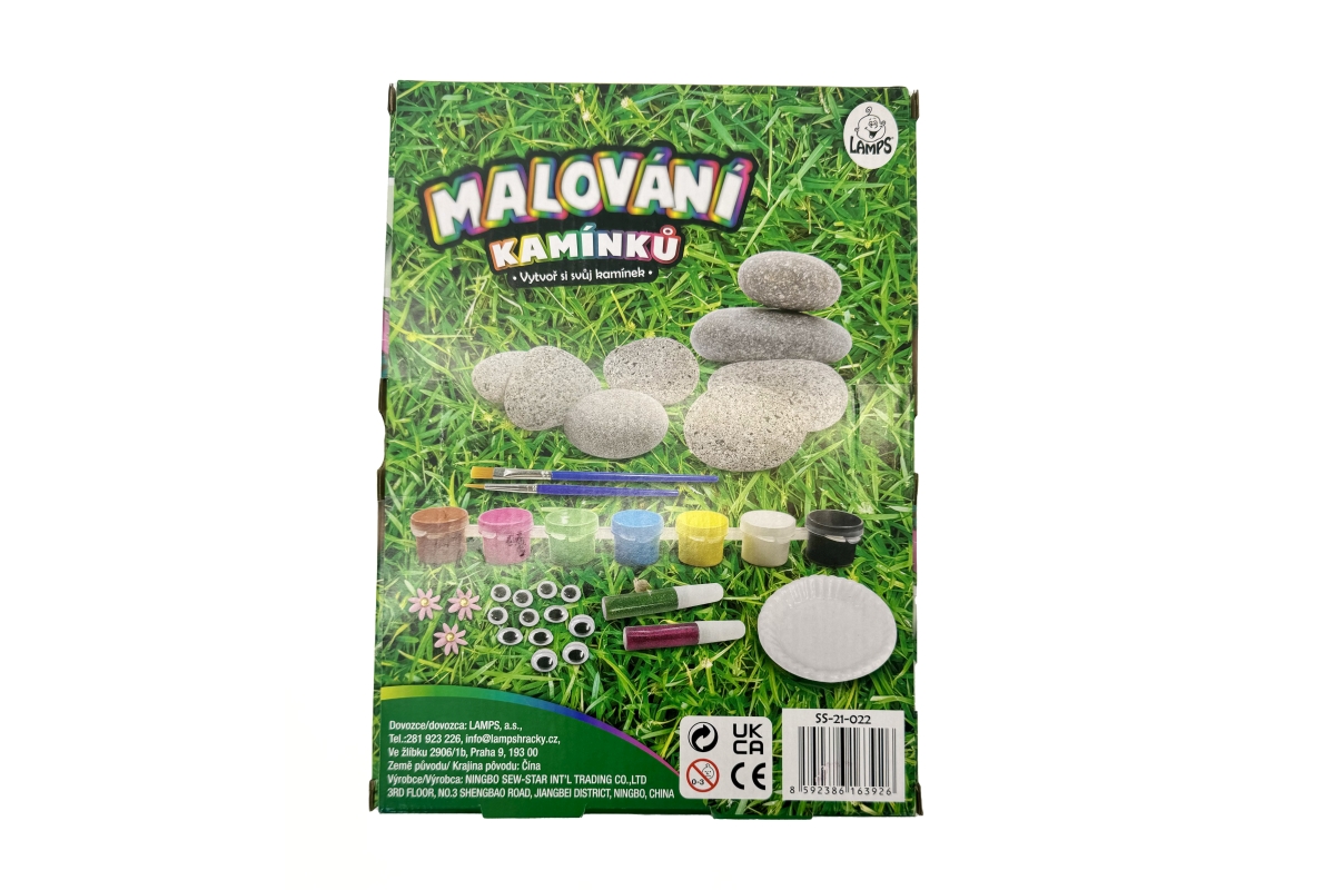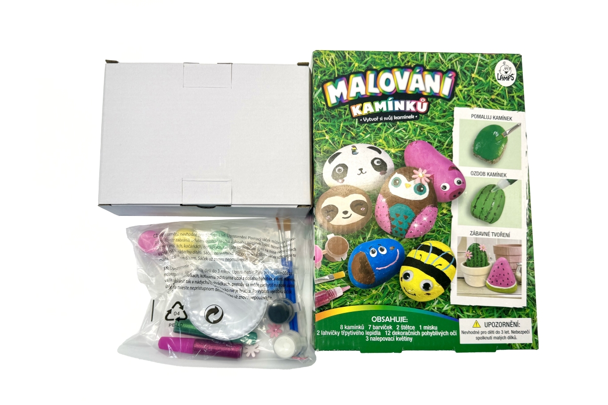Malování kamínků. Sada obsahuje 8 kamínků, 5 barviček, 2 štětce, 12 dekoračních pohyblivých očí, atd. Baleno v krabičce. Rozměry balení cca 18x25x5,5 ..