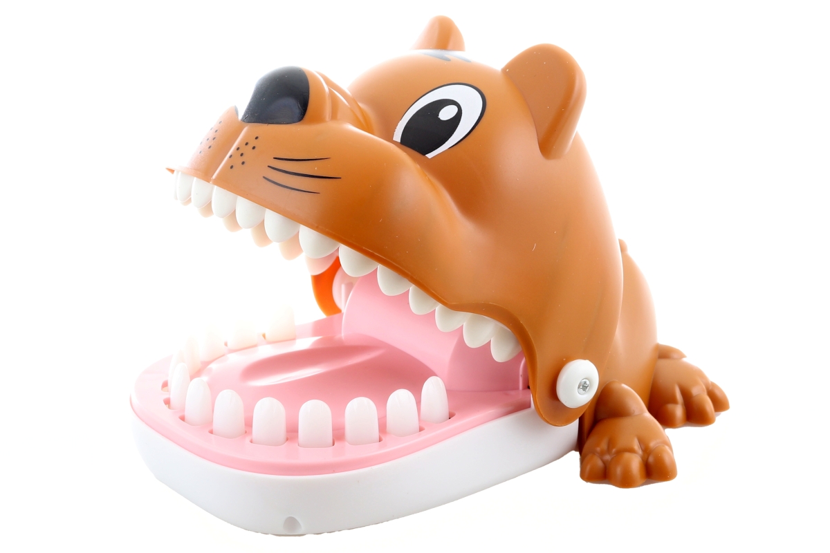 Hra tygří zuby. Materiál plast. Hráči postupně zatlačují zuby tygra a koho tygr nekousne, vyhrává. Baleno v krabičce. Rozměry balení 16x10x13 cm. Věk ..