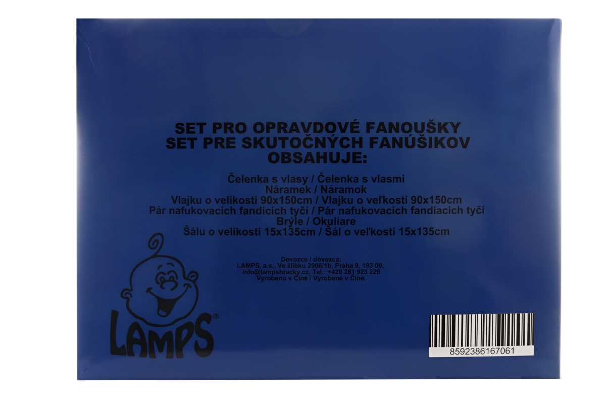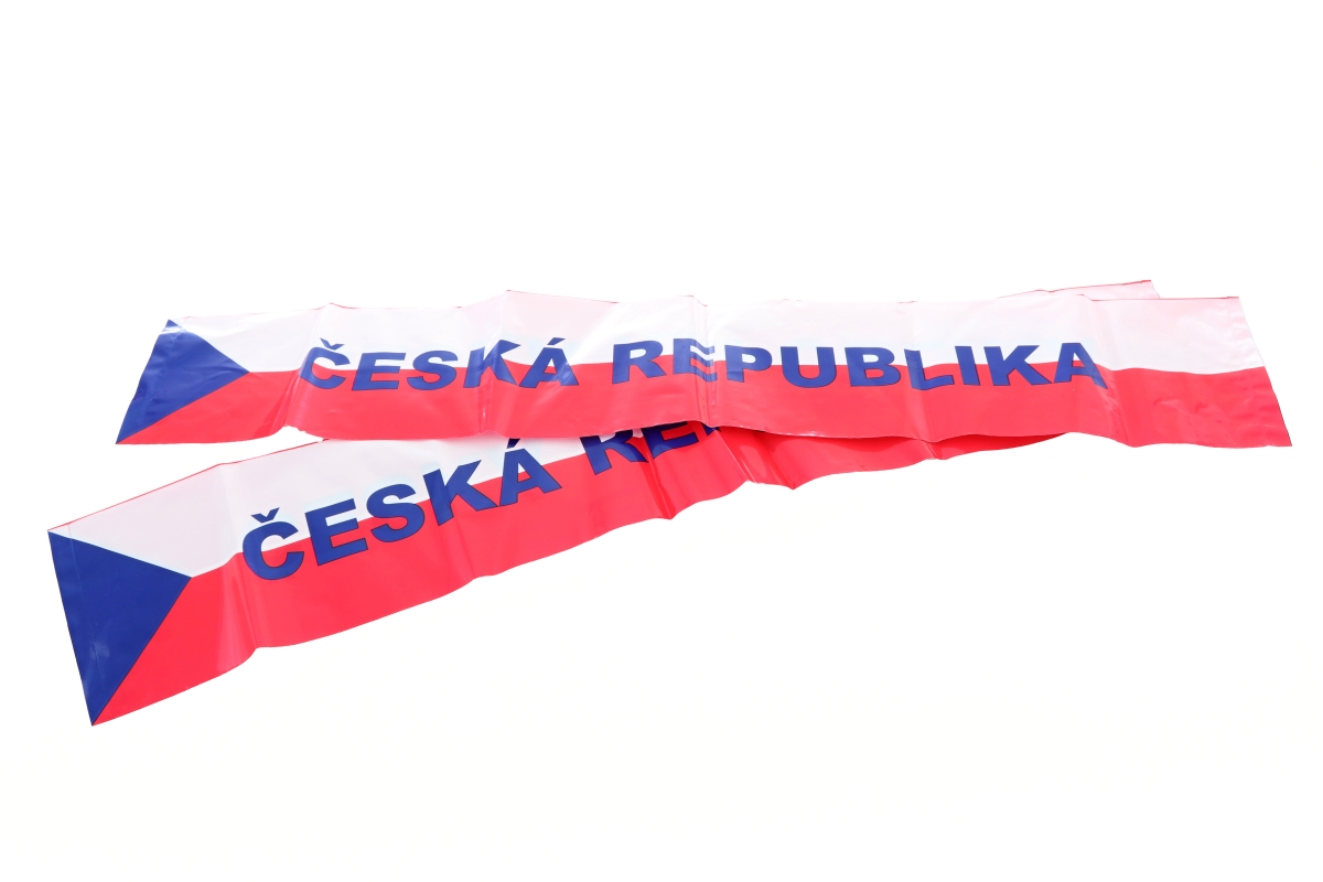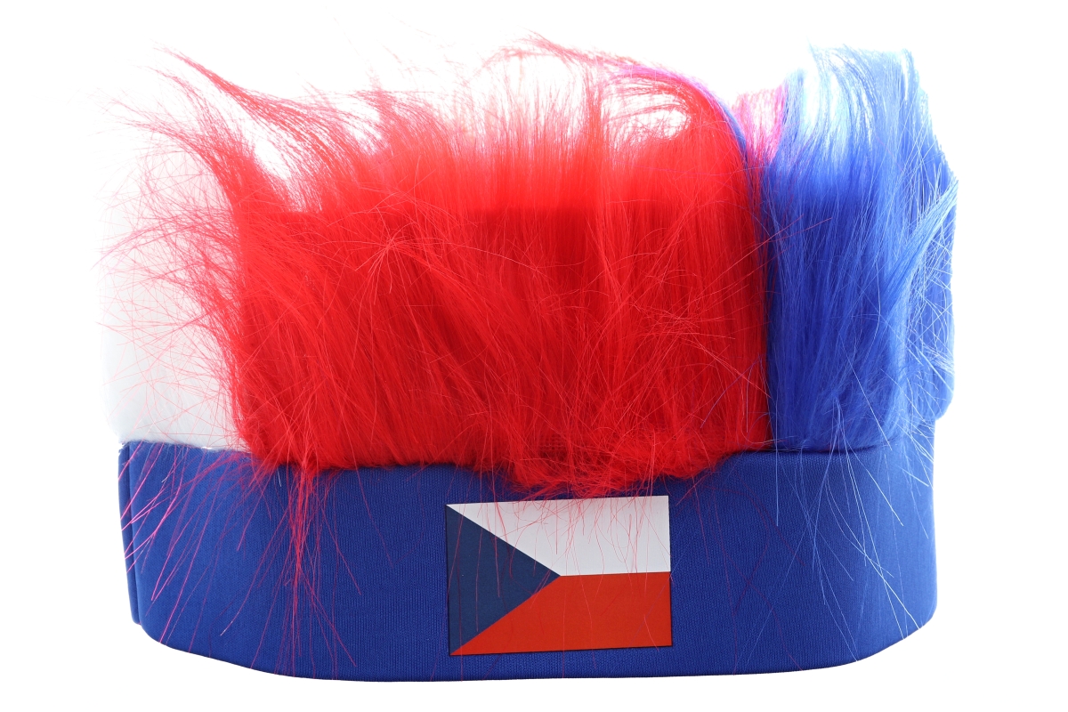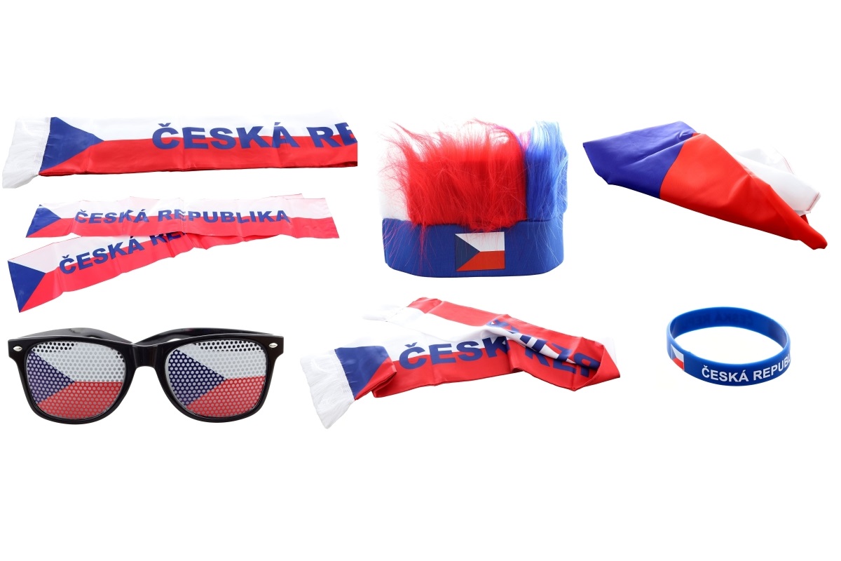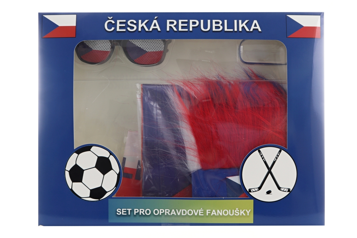 Krásný velký fanouškovský set Česká Republika. Balení obsahuje čelenku s vlasy, náramek, vlajku o velikosti 90x150 cm, pár nafukovacích fandících tyčí..