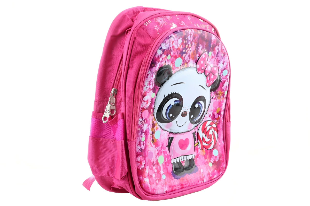 Veselý dětský batoh s motivm roztomilé pandy. Batoh má 2 přihrádky na zip. Z obou stran je také přihrádka na lahev nebo jiné drobnosti. Batoh je pevný..