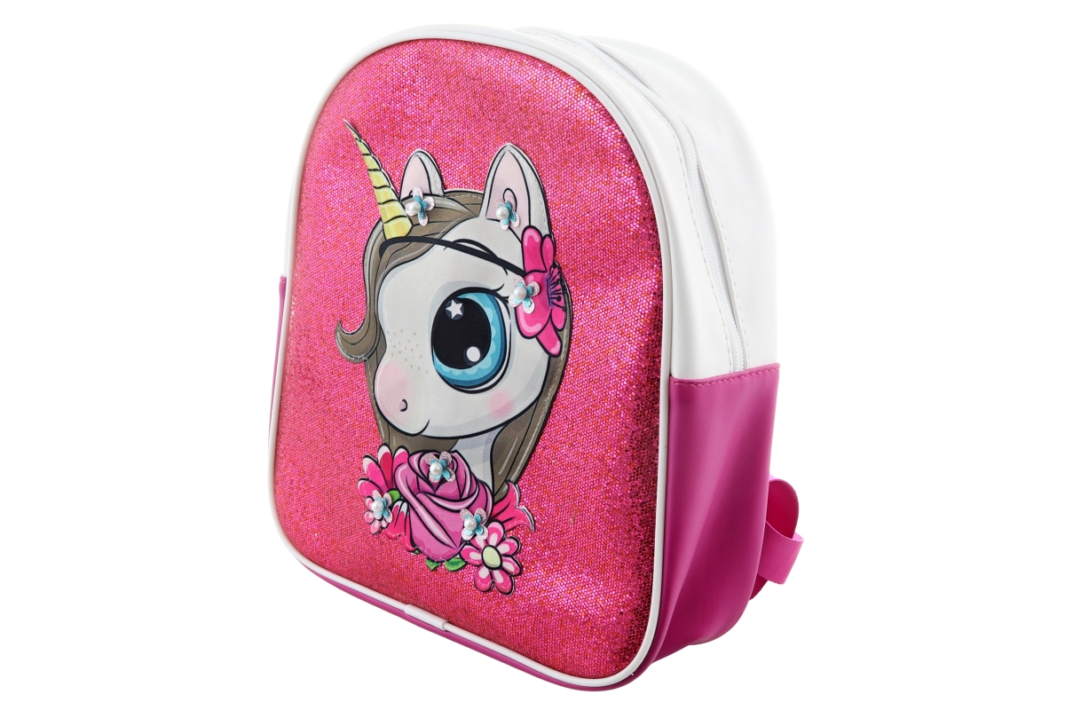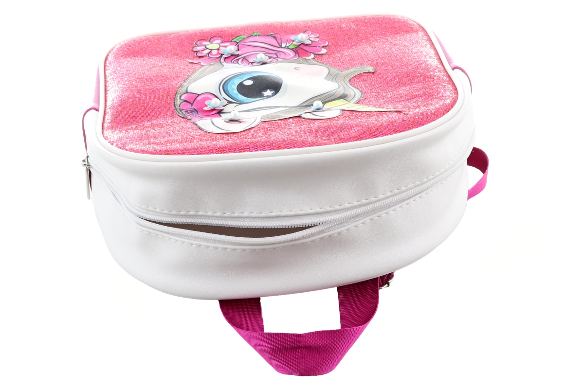 Veselý batůžek s motivem jednorožce. Batoh má 1 velkou přihrádku na zip. Je pogumovaný, obrázek na přední straně je látkový. Rozměry cca 26x28x6,5 cm...