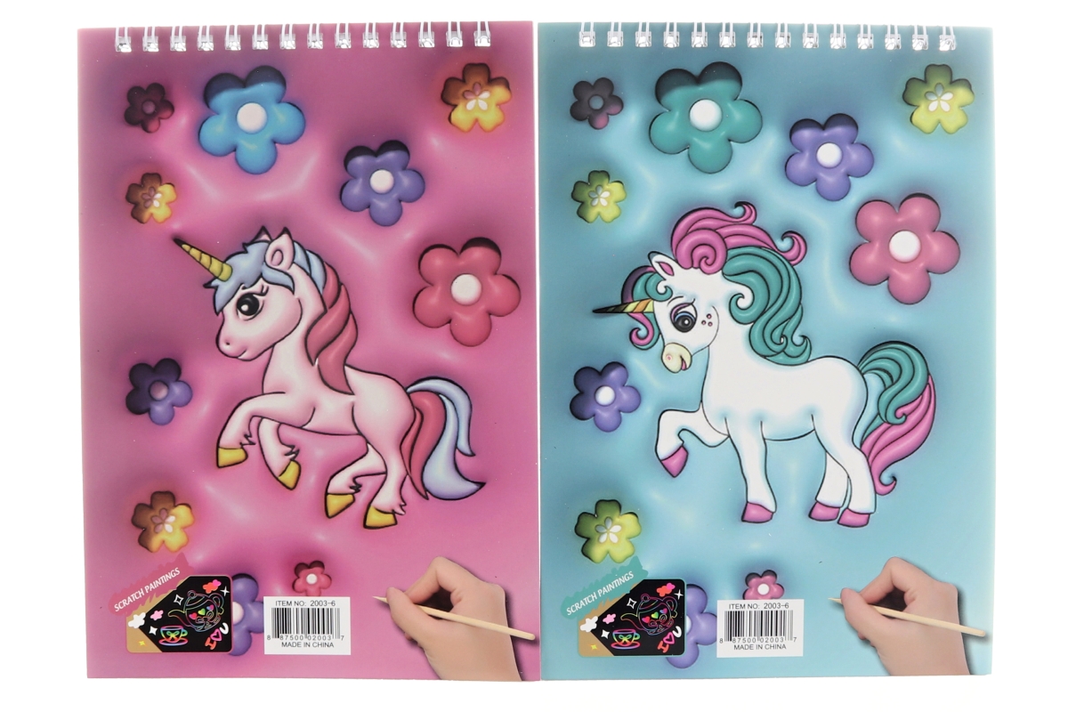 Vyškrabovací sešit s kroužkovou vazbou. obsahuje 8 černých listů s barevným podkladem, kde si dítě může namalovat obrázek dle vlastní fantazie. Součás..