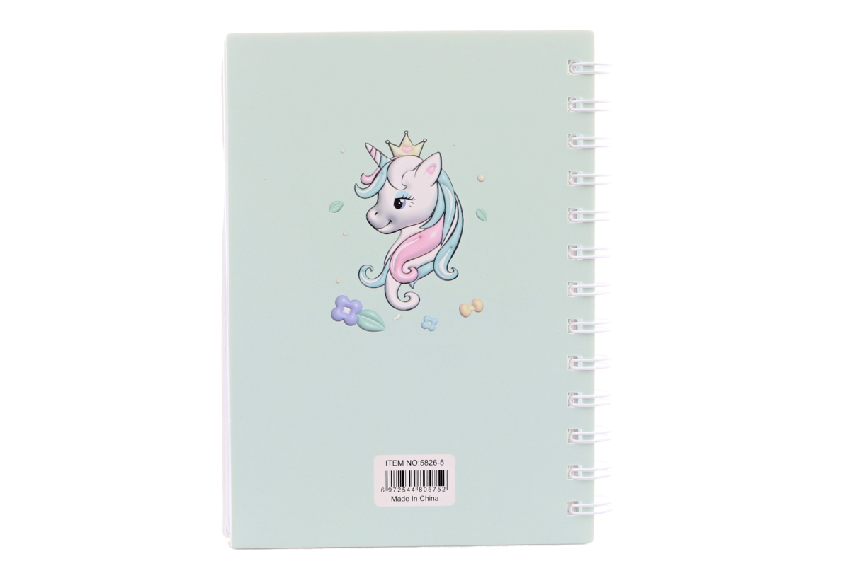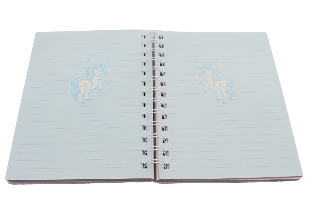 Zápisník s kroužkovou vazbou a motivem jednorožce. Rozměr 17,6cm x 12,5cm. Obsahuje 80 linkovaných listů ve 2 barvách. Baleno v sáčku. Přední desky s ..
