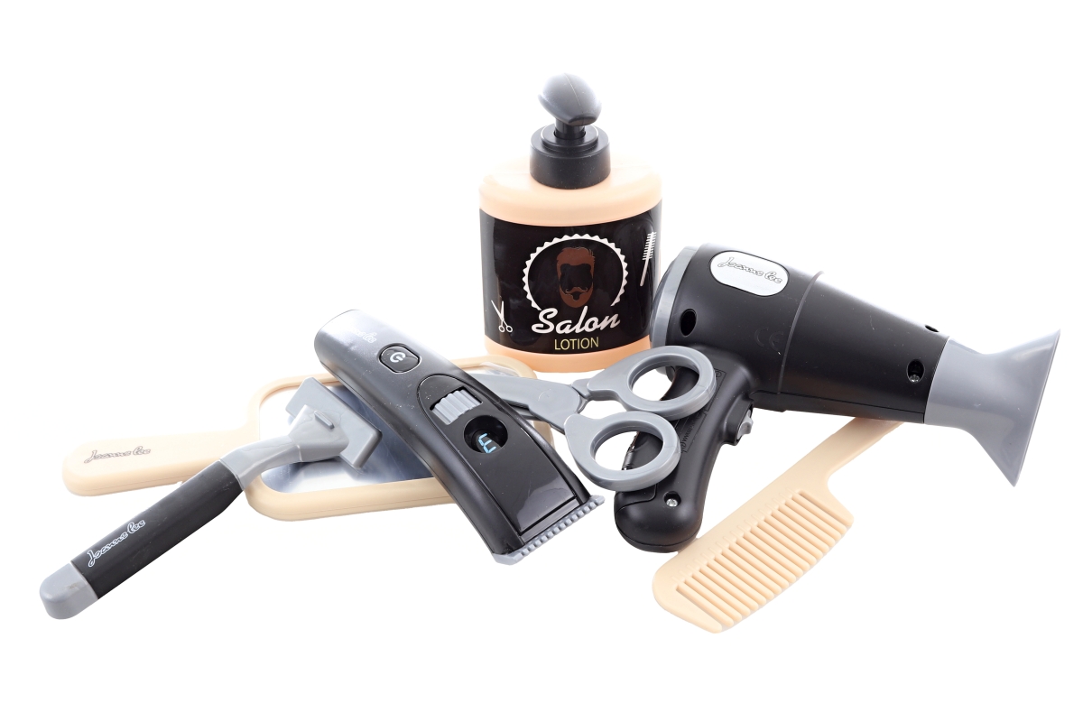 Kadeřnická sada pro kluky. Balení obsahuje látkový opasek (délka s popruhem cca 85 cm), fén a spoustu doplňků. Fén je napájen na 2xAAA baterie (nejsou..