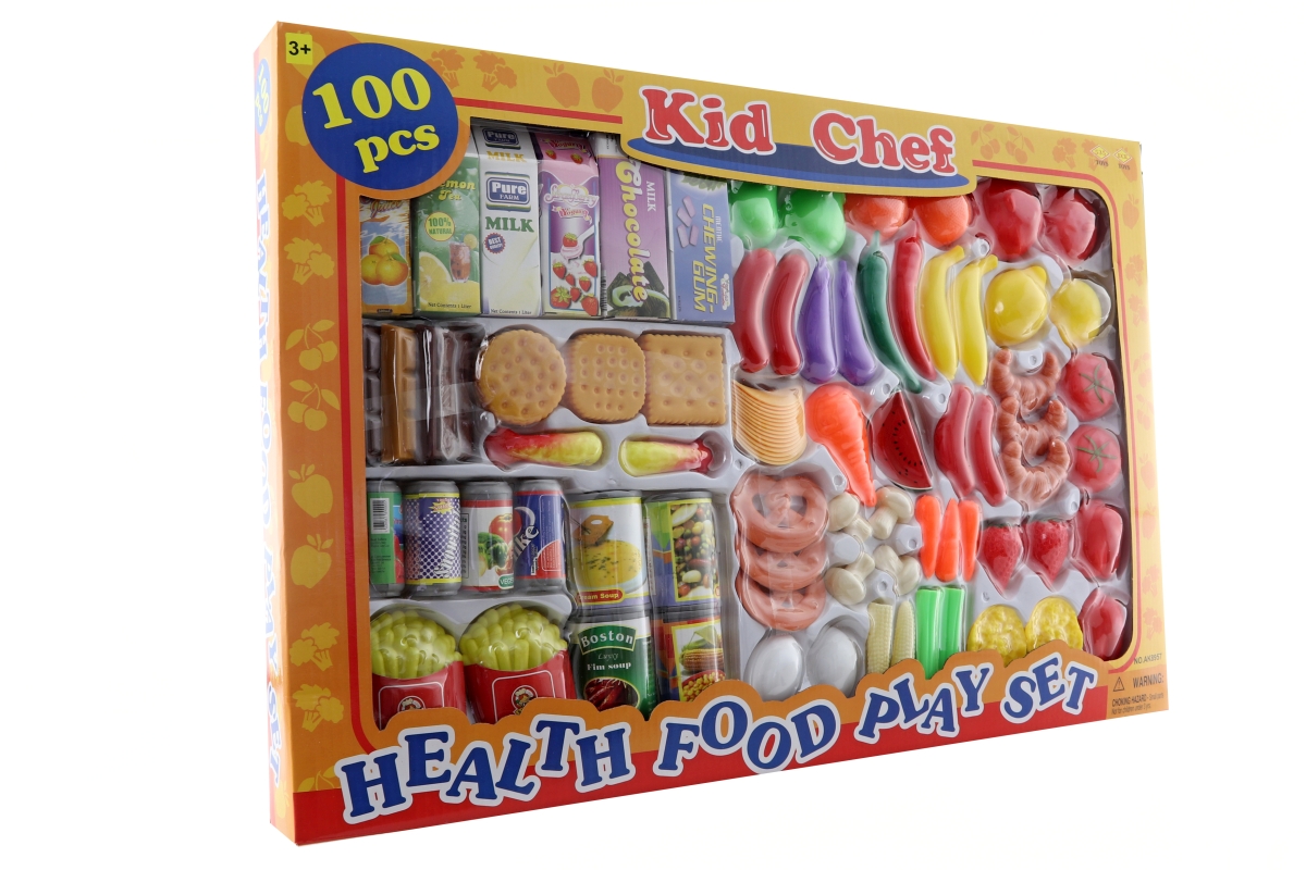 Velká sada jídla . Balení obsahuje celkem 100 dílků (ovovce, zeleninu, pečivo, sladkosti, plechovky a kartonové nápoje). Rozměry balení cca 58x39x5 cm..