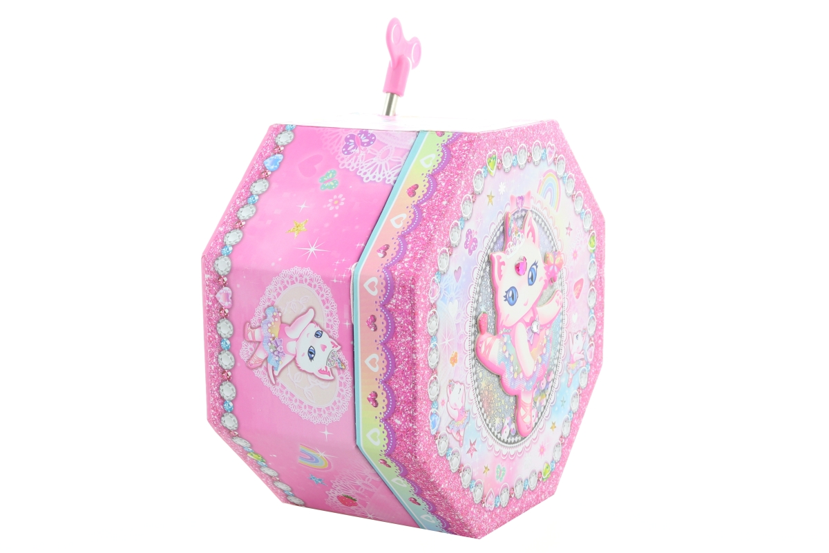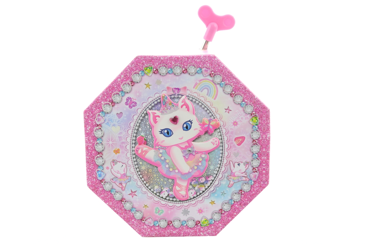 Hrací skříňka šperkovnice truhla. Uvnitř špekovnice je zrcátko a kočka, která po natažení klíčku tančí a hraje. Velikost cca 13 x 13 x 7 cm. Baleno v ..
