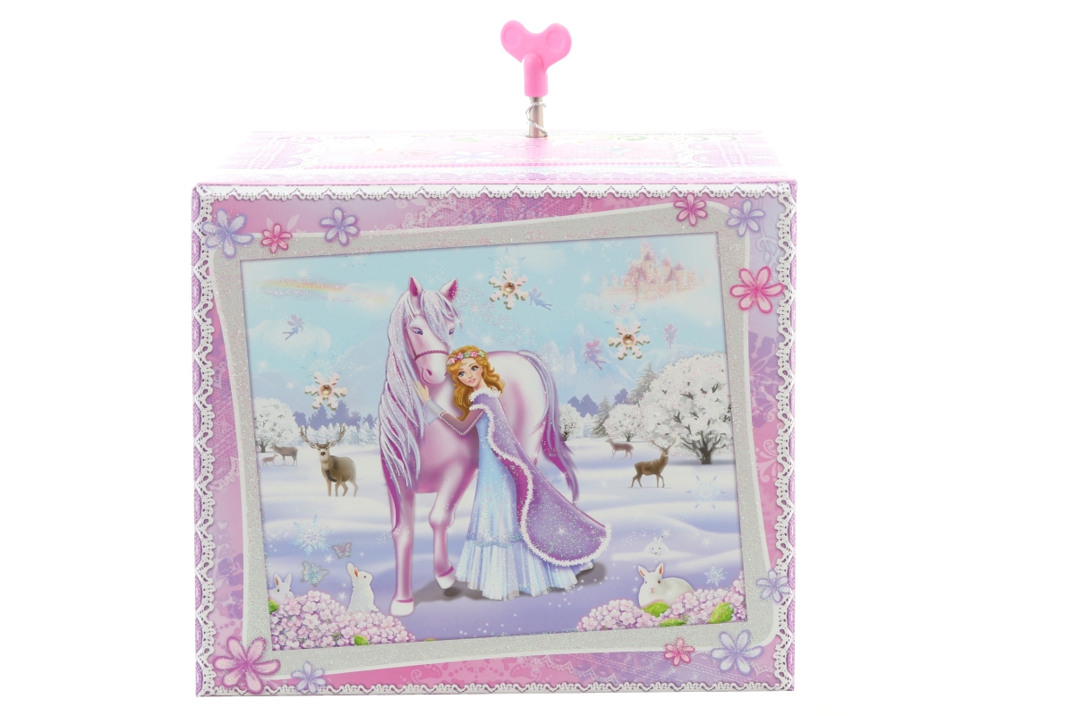 Hrací skříňka šperkovnice truhla. Uvnitř špekovnice je zrcátko a jednorožec, který po natažení klíčku tančí a hraje. Velikost cca 16 x 14 x 9 cm. Bale..