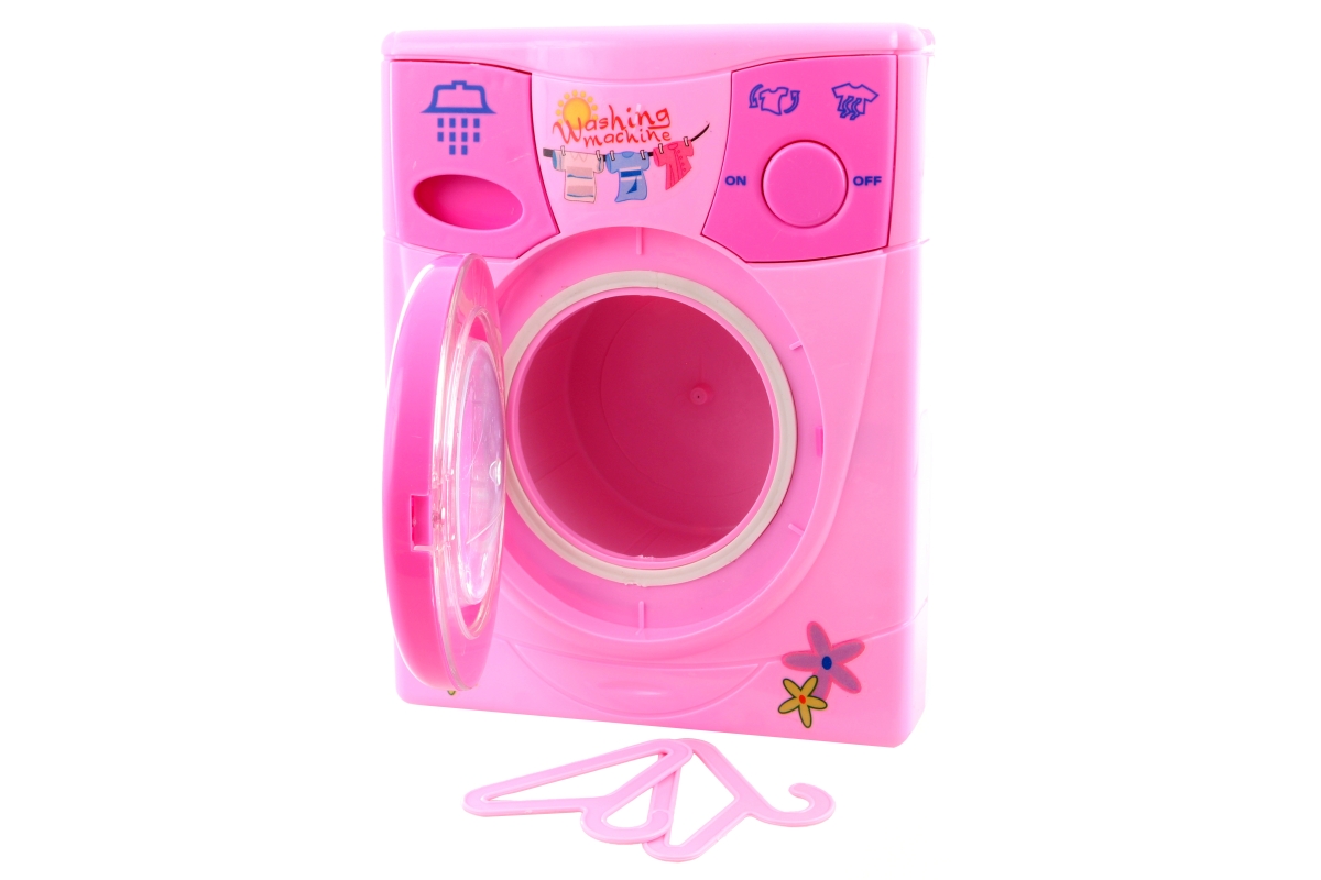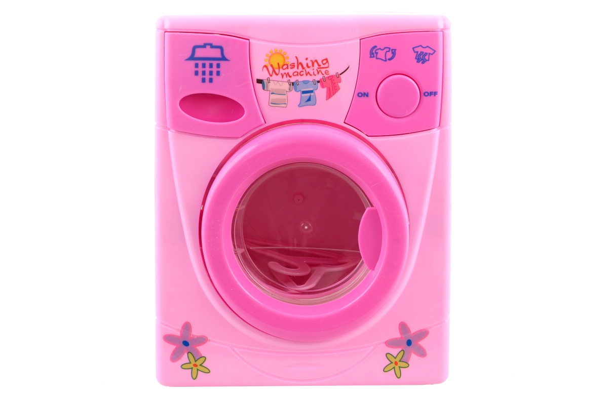 Pračka na baterie a vodu, růžová. Rozměry 15 x 12 x 19,5 cm. Napájení na 2x AA baterie (nejsou součástí). Obsahuje také 2 ramínka. Materiál plast. Věk..