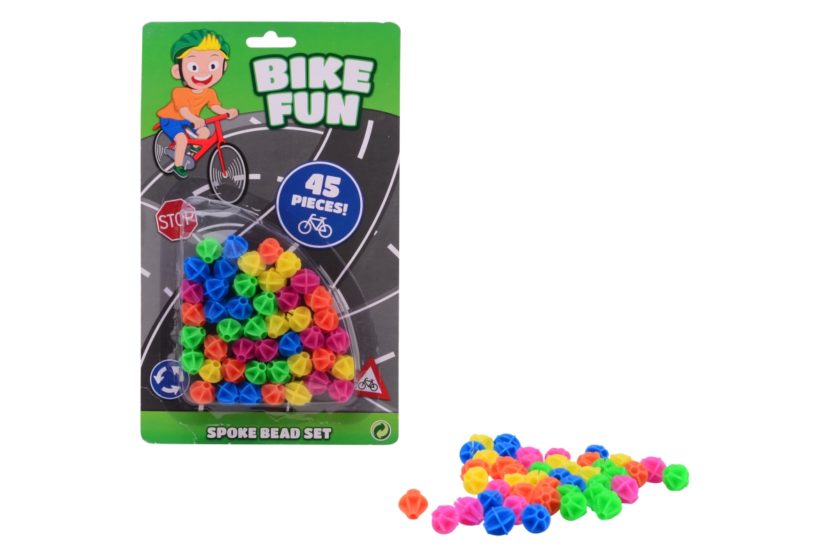 Barevné ozdobné korálky na kolo. Materiál plast. Balení obsahuje 45 korálků. Po instalaci se hýbou nahoru a dolů podle pohybu kola. Výrobek není hračk..