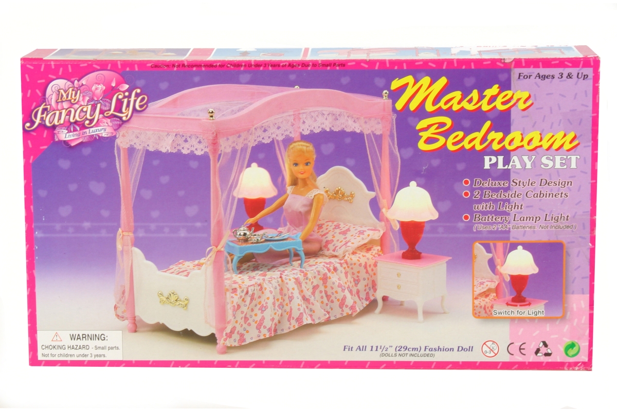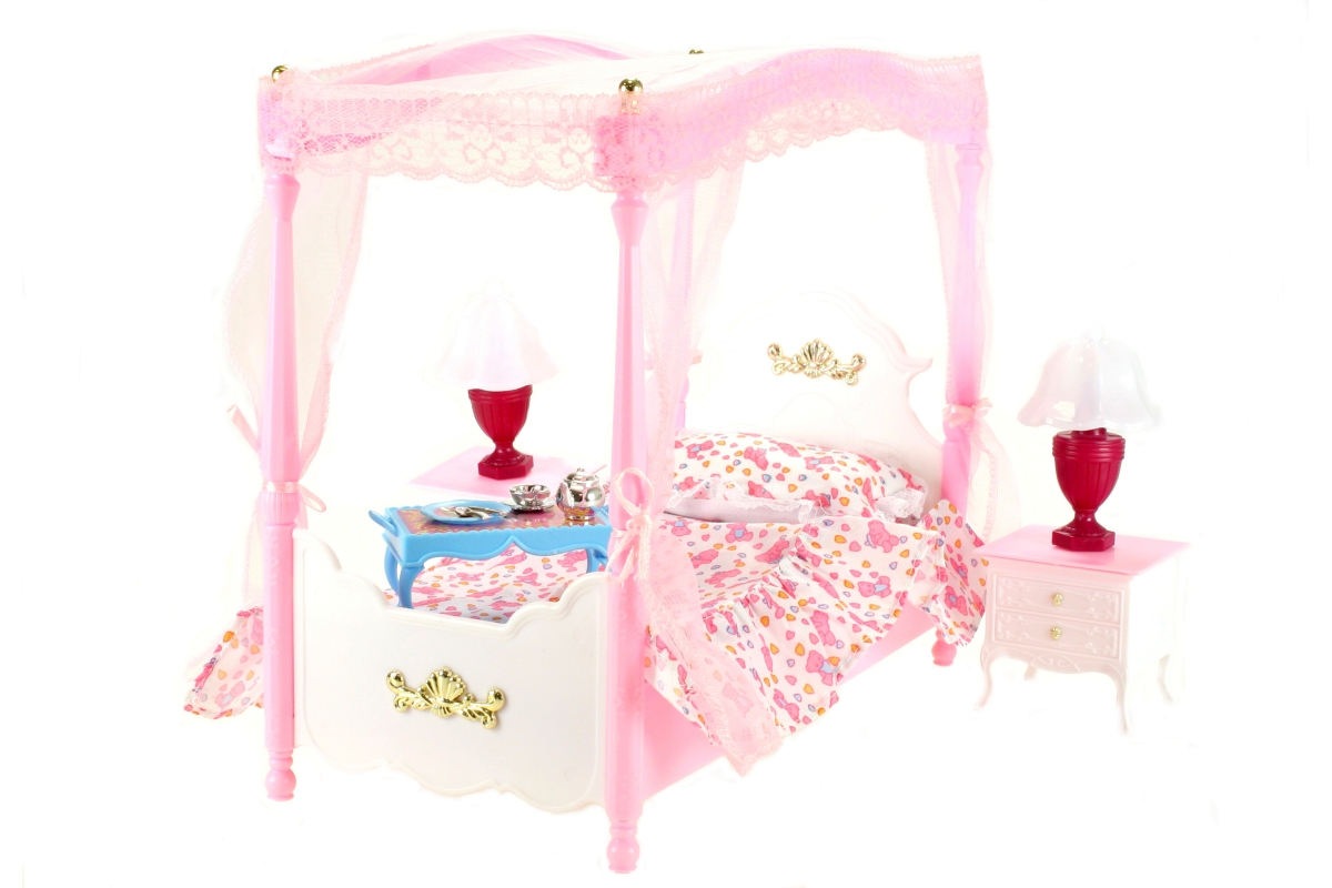 Glorie Postel s nebesy obsahuje plastovou postel o rozměrech cca 15,5 cm X 33 cm X 27 cm s přehozem přes postel,polštářkem a nebesy.Součástí balení 2 ..