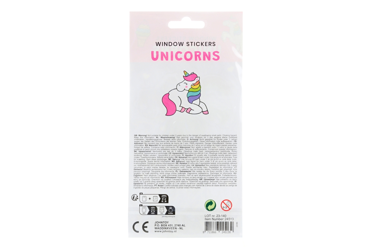 Okenní samolepky v motivu jednorožců. Balení obsahuje 1 arch s 8i samolepkami. Rozměry balení cca 10,5x20 cm. Věk 3+..
