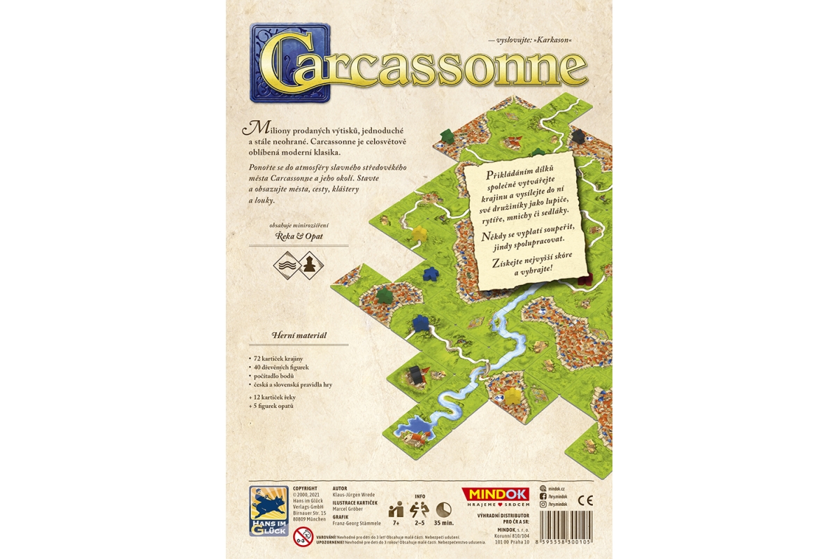 Jihofrancouzské město Carcassonne je pověstné svým jedinečným opevněním, které se vyvíjelo od římských dob až po časy rytířů. Hráči se vydávají se svou družinou na cesty a louky, do měst a klášterů, aby hledali štěstí kolem Carcassonne. Vzhled krajiny je v jejich rukou a strategické rozmístění družiníků, ať už sedláků, lupičů, mnichů nebo rytířů, určuje cestu k úspěchu. Hráči vykládají jeden po druhém karty s motivem krajiny. Vznikají cesty, města, louky a kláštery, na které mohou hráči umístit své figurky, aby sbírali body. Body se započítávají jak v průběhu hry, tak na jejím konci, a proto je vítěz znám až po konečném sčítání. Tak jako je jihofrancouzské město Carcassonne pověstné svým jedinečným opevněním, tak se hra Carcassonne stává pověstnou svou úspěšností. Od jejího uvedení na trh v roce 2001 se prodalo již několik milionů kusů. Obsah balení: 72 stavebních karet 8 figurek pro 5 hráčů (celkem 40 figurek) 1 počitadlo bodů česká a slovenská pravidla