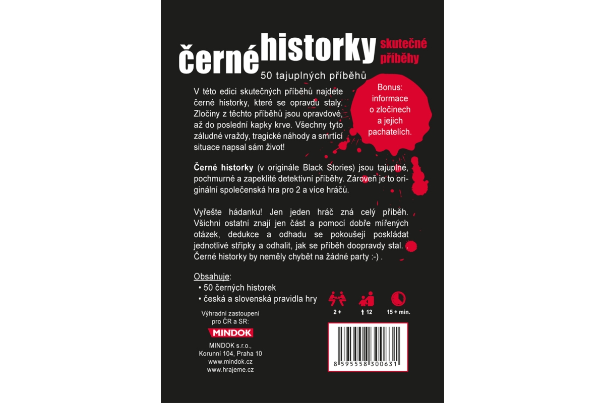 Černé historky by neměly chybět na žádné párty! Hráči se snaží zrekonstruovat celou historku pomocí otázek, na které jim moderátor opovídá pouze ano nebo ne. Strašidelná hra na jakoukoliv párty, k vodě nebo třeba na cestu autem. Vyřešte hádanku! Jen jeden hráč zná celý příběh. Všichni znají jen část a pomocí dobře mířených otázek, dedukce a odhadu se pokoušejí poskládat jednotlivé střípky a odhalit, jak se příběh doopravdy stal. Tyto někdy strašidelné, ale vždy zábavné příběhy si vás i vaše přátele rychle získají