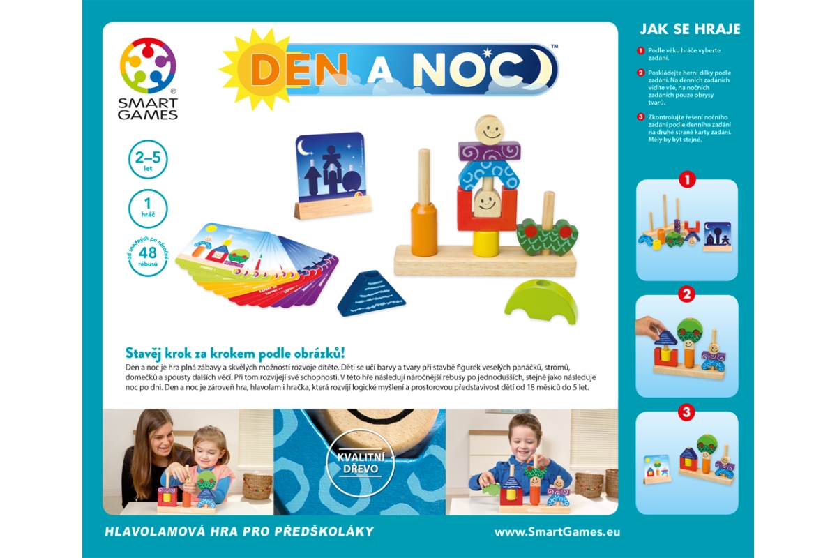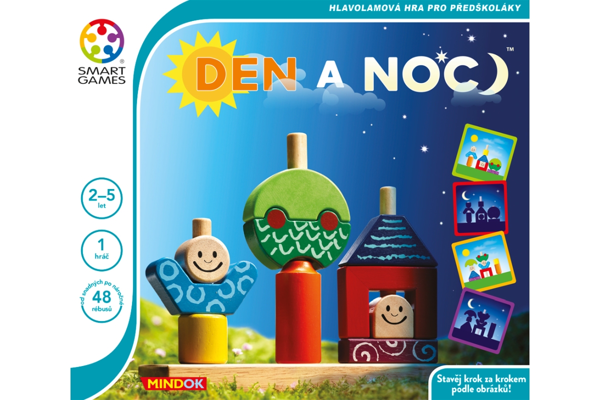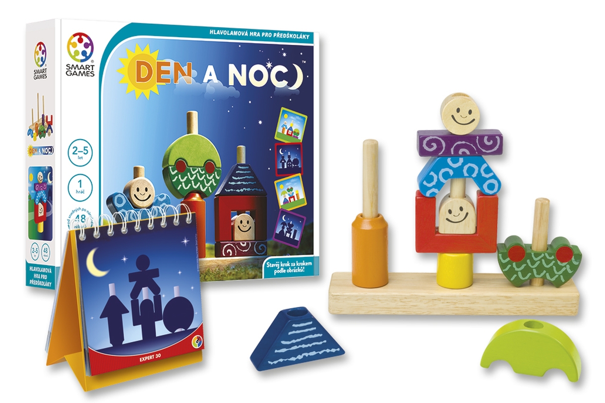 Den a noc je jedinečně zpracovaná logická hra pro jednoho hráče. Je vyrobena ze dřeva, krásně barevná a založena na myšlence, která rozvíjí logické myšlení a představivost i těch nejmenších dětí. Hra den a noc obsahuje 48 různých zadání ve čtyřech úrovních obtížnosti. Na zadáních jsou vyobrazeny obrysy staveb, které mají děti za pomoci dřevěných dílků sestavit. Nejjednodušší úlohy zvládnou i opravdu malé děti. Hra Den a noc je určena již pro děti od dvou let.