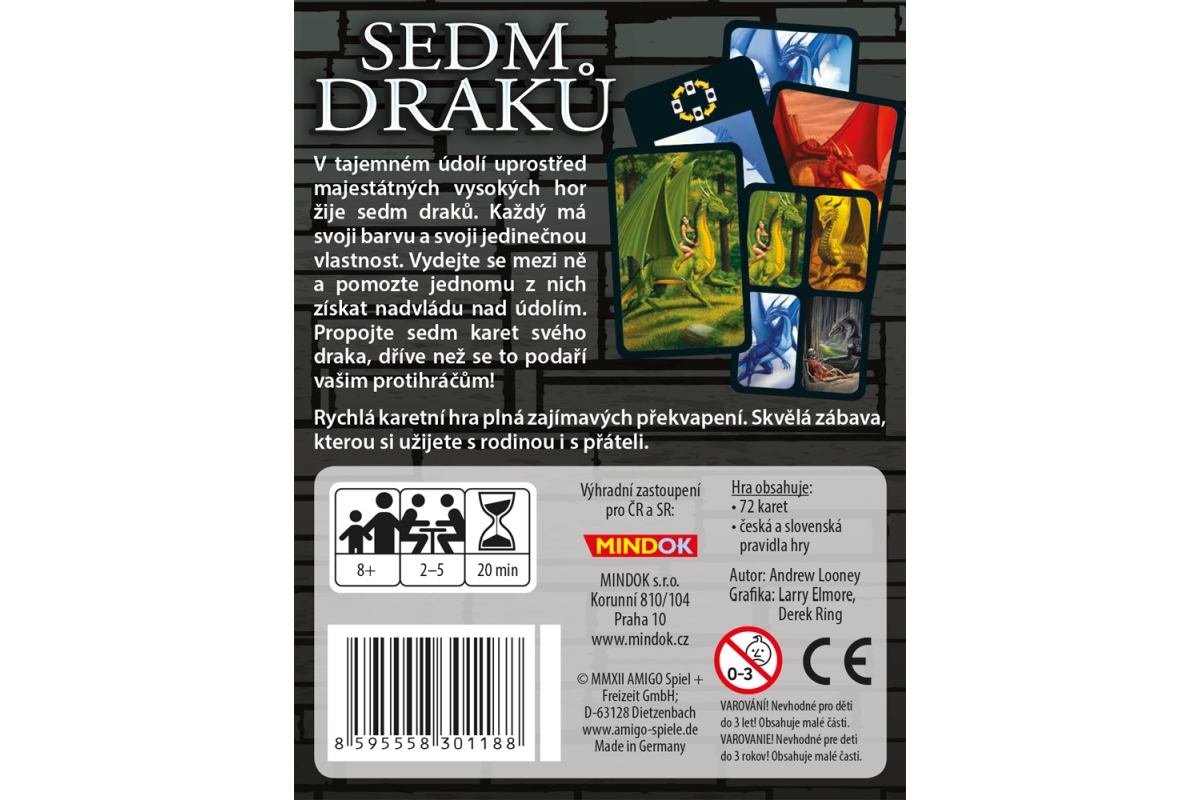Rychlá karetní hra plná zajímavých překvapení. Skvělá zábava, kterou si užijete s rodinou i s přáteli. V tajemném údolí uprostřed majestátných vysokých hor žije sedm draků. Každý má svoji barvu a svoji jedinečnou vlastnost. Vydejte se mezi ně a pomozte jednomu z nich získat nadvládu nad údolím. Propojte sedm karet svého draka, dříve než se to podaří vašim protihráčům! Pro 2 - 5 hráčů. Časová náročnost cca 20 minut. Věk 8+