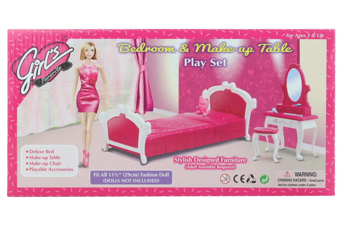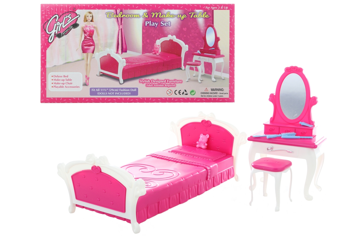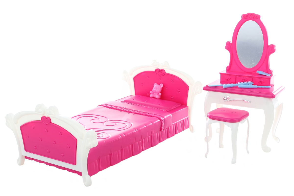 Glorie ložnice obsahuje plastovou postel, kosmetický stolek s doplňky pro panneky - hřebínek, krém, kartáč a stoličku .Panenka není součástí balení. R..