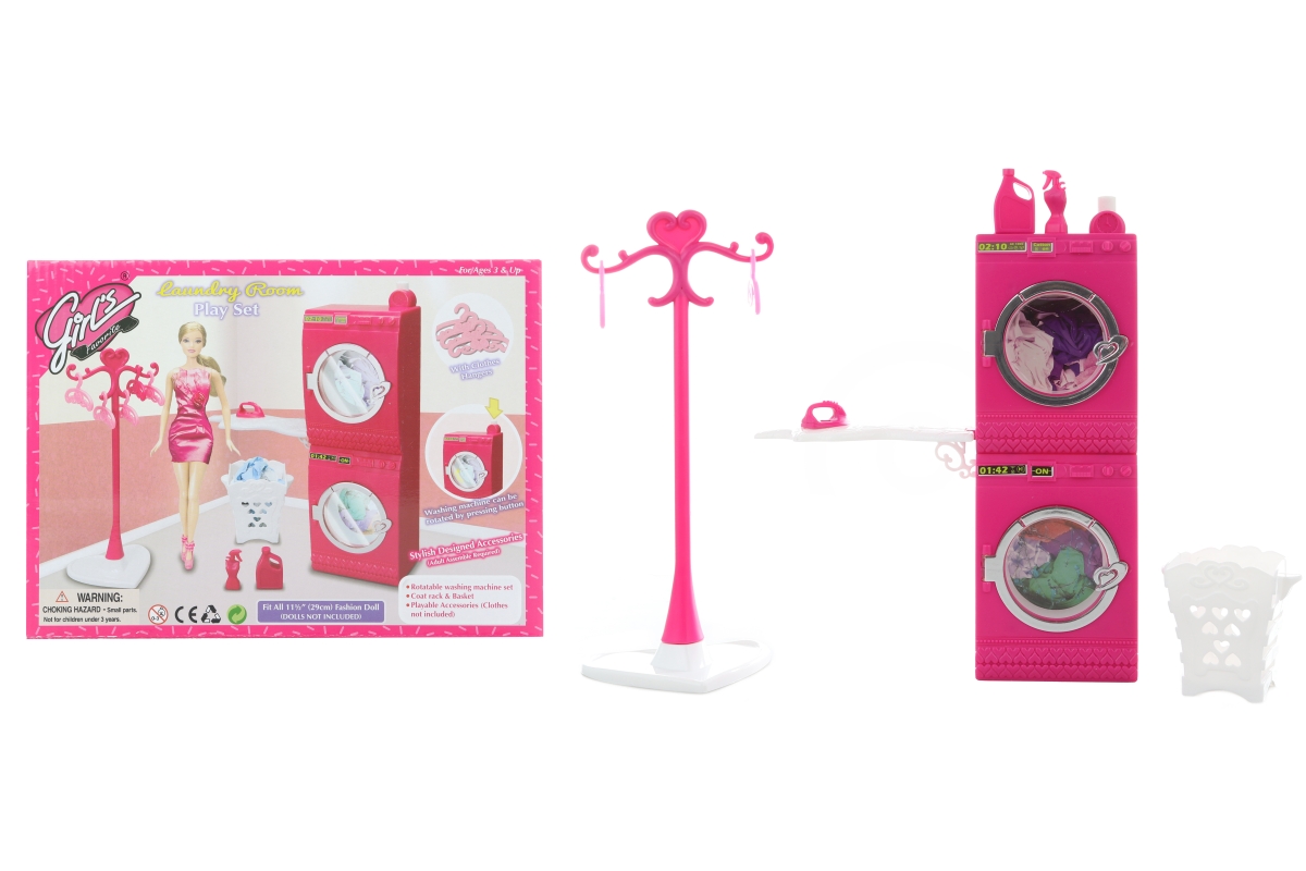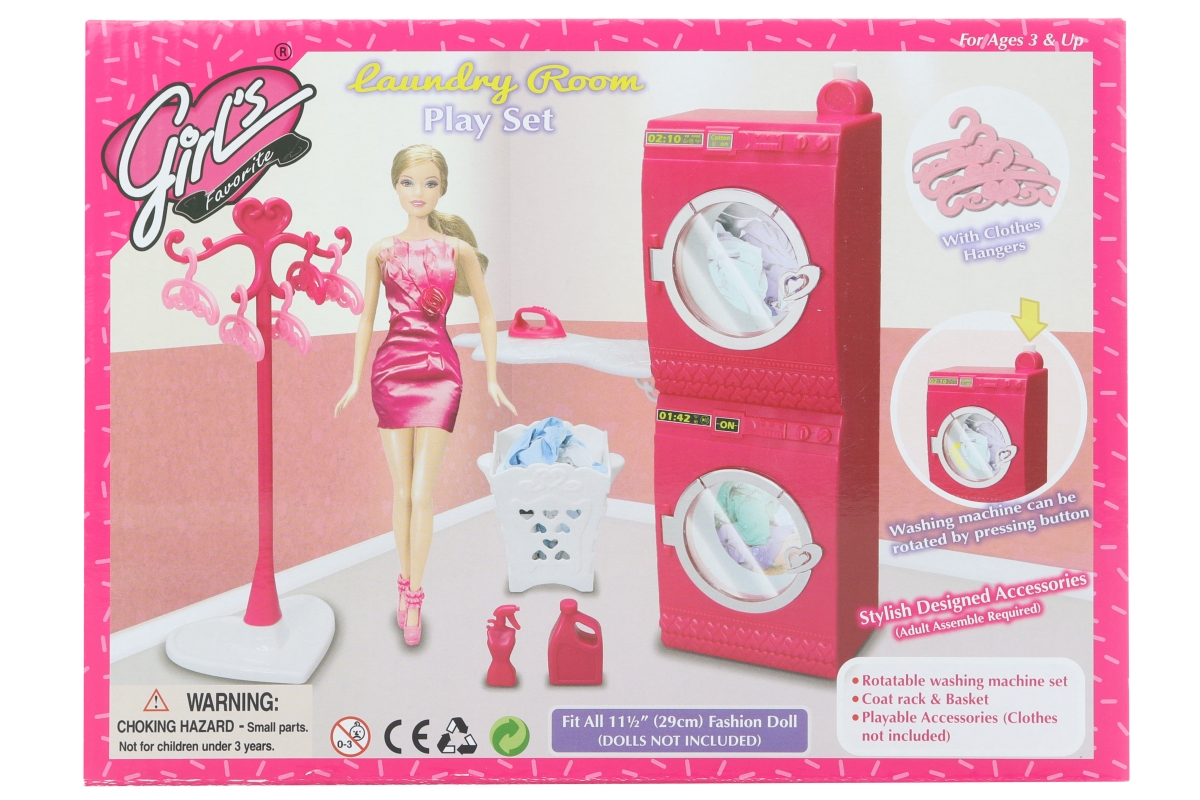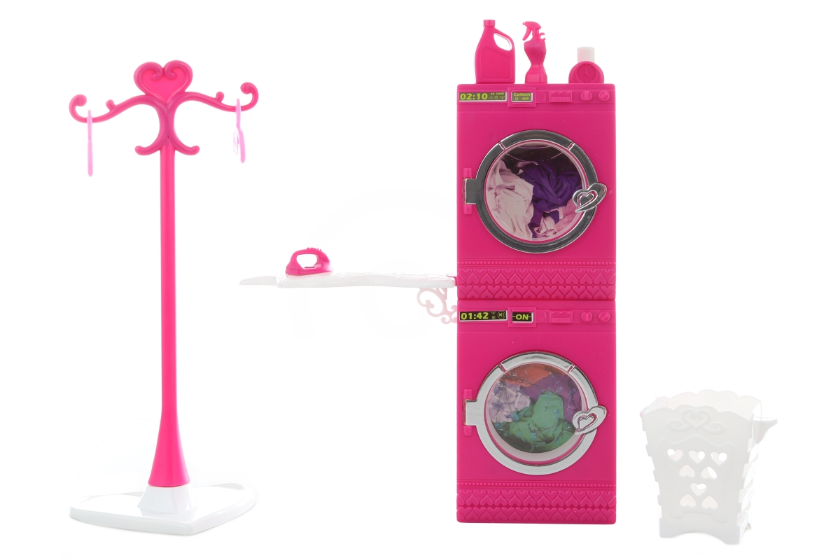 Glorie prádelna pro panenky. Balení obsahuje pračku, sušičku, věšák, žehlící prkno, koš na prádlo a ramínka. Po zmáčknutí tlačítka se pračka otáčí. Pa..